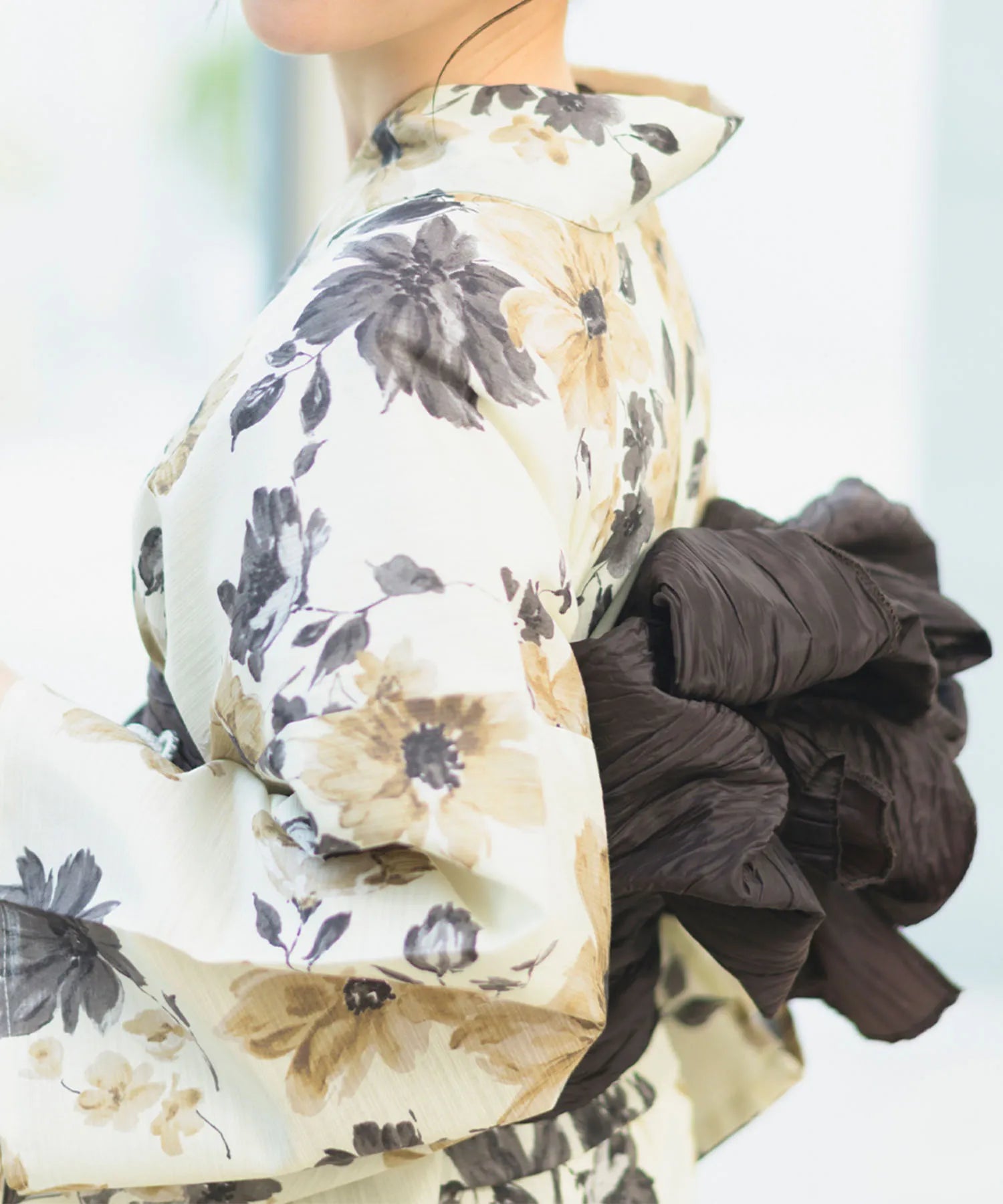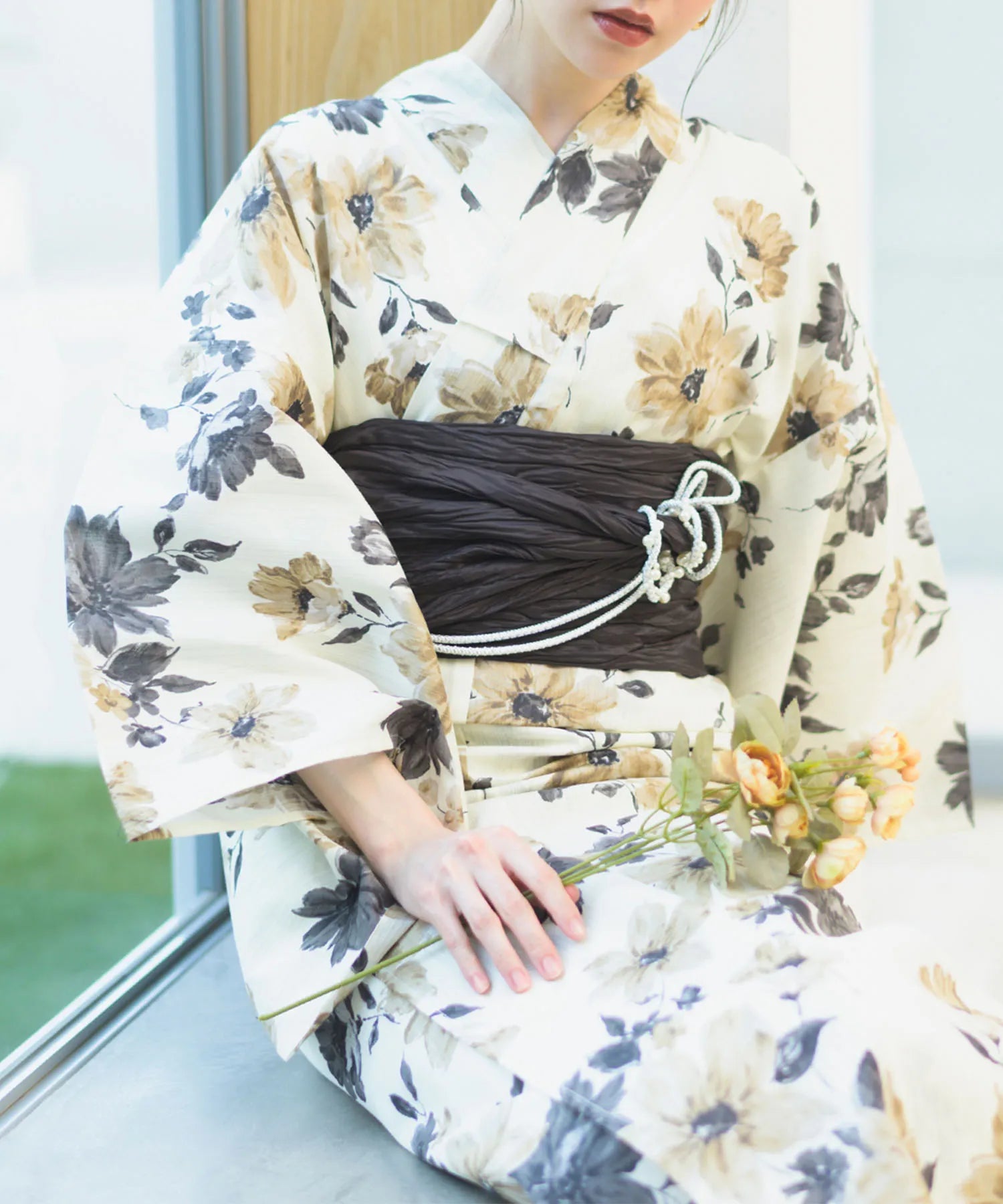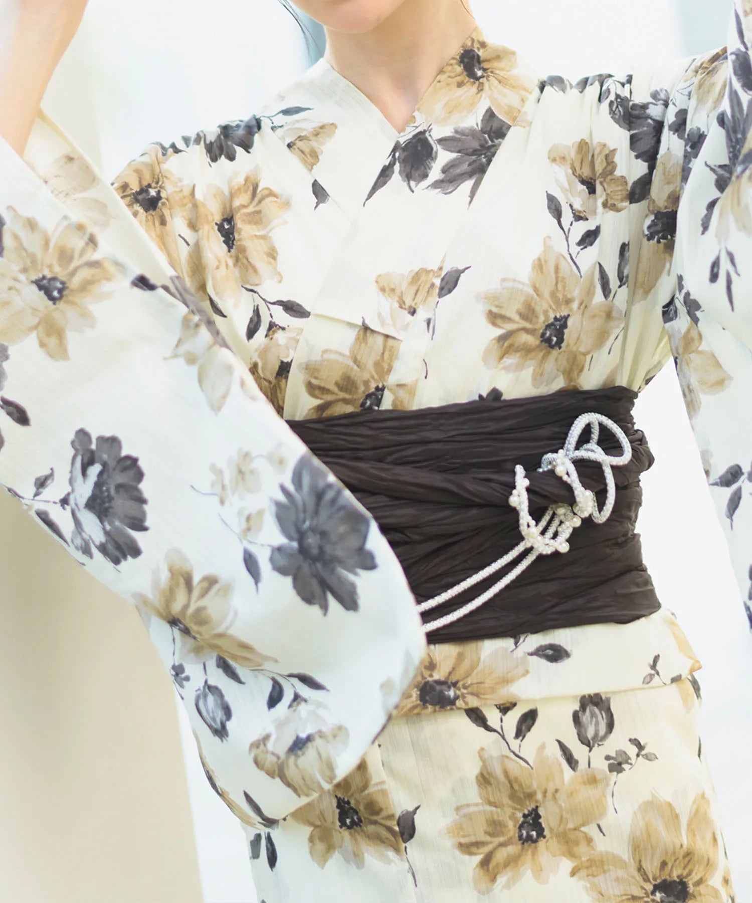 上品なベージュの地に優美な花々が織りなす香り高い浴衣。