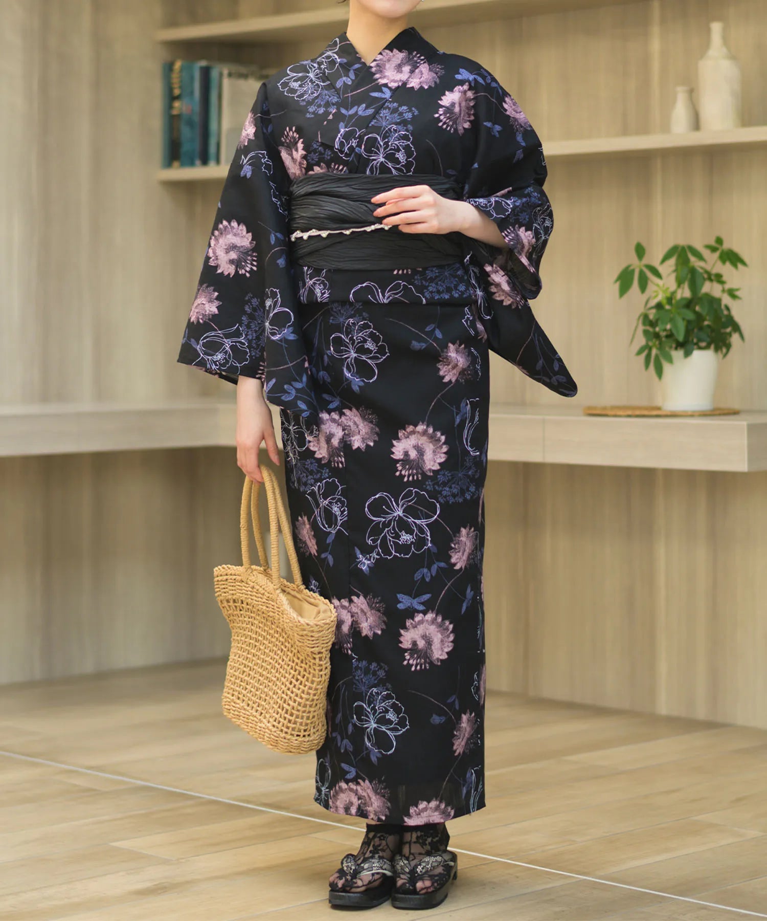 黒地にピンク、藍、白の線画で描かれた花々が幻想的な雰囲気を演出する浴衣。