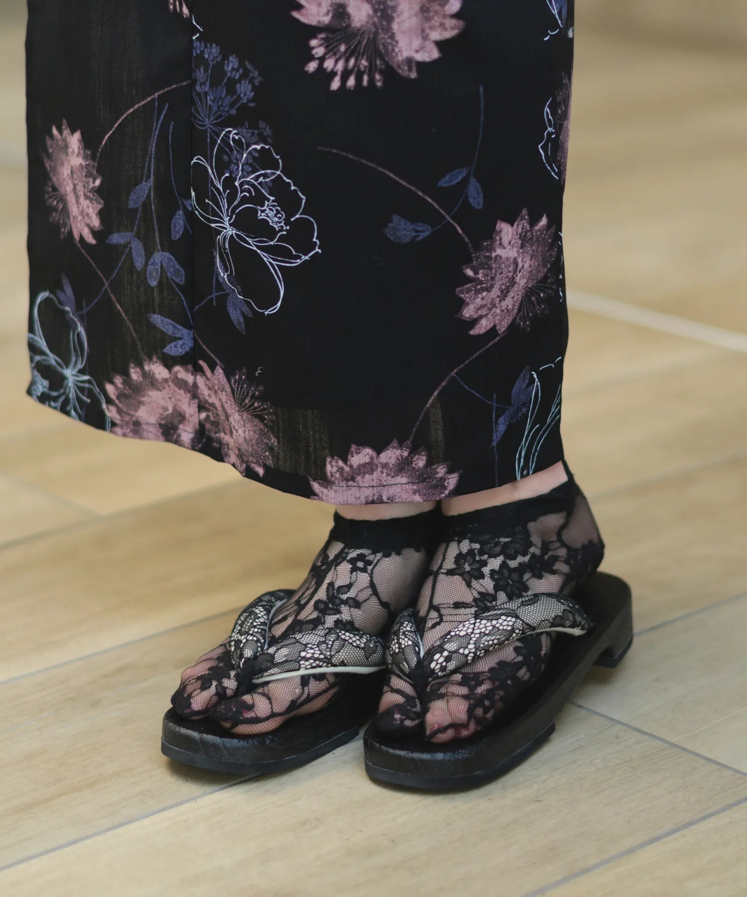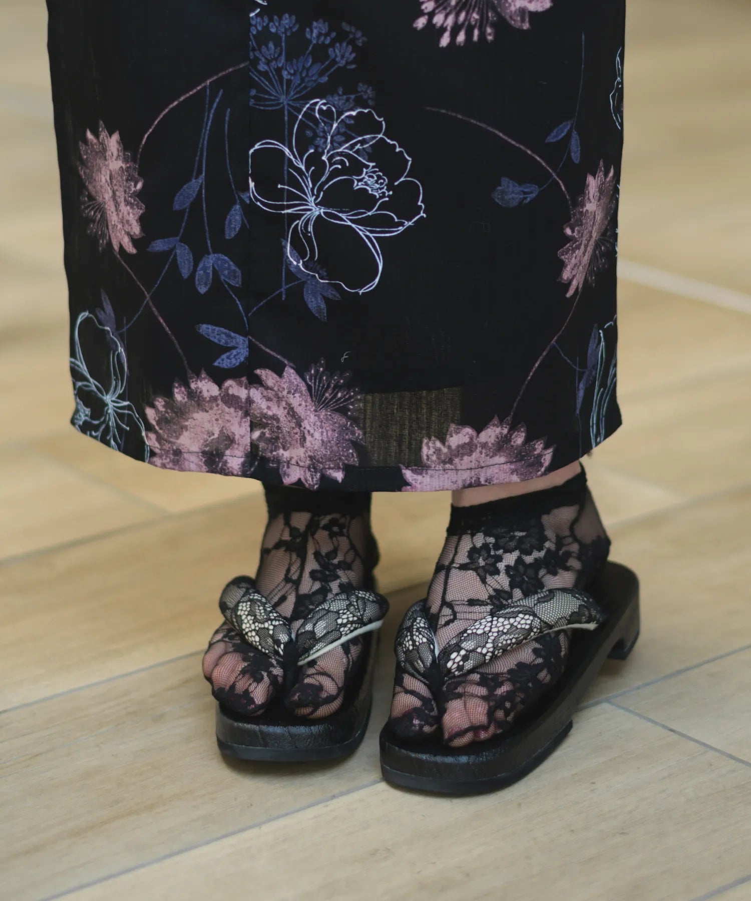 帯と同じ墨色のレース鼻緒下駄で足元まで大人っぽく。レース足袋合わせもおすすめです。