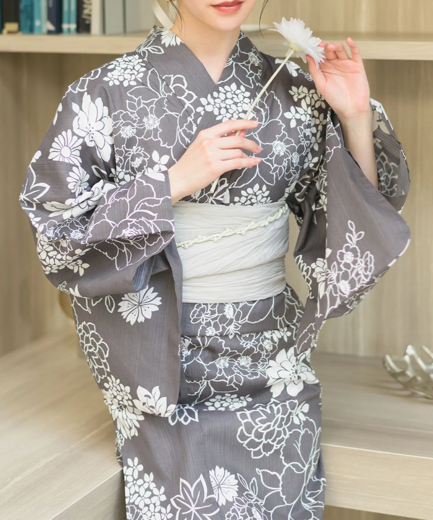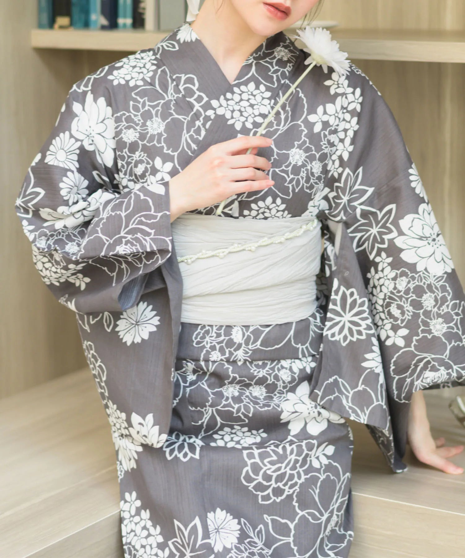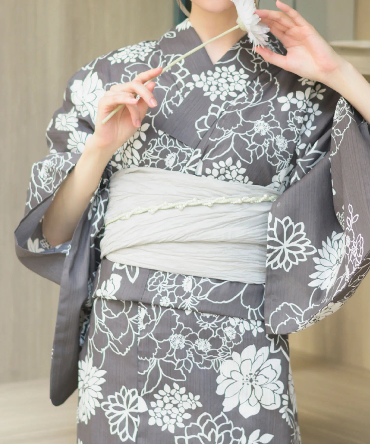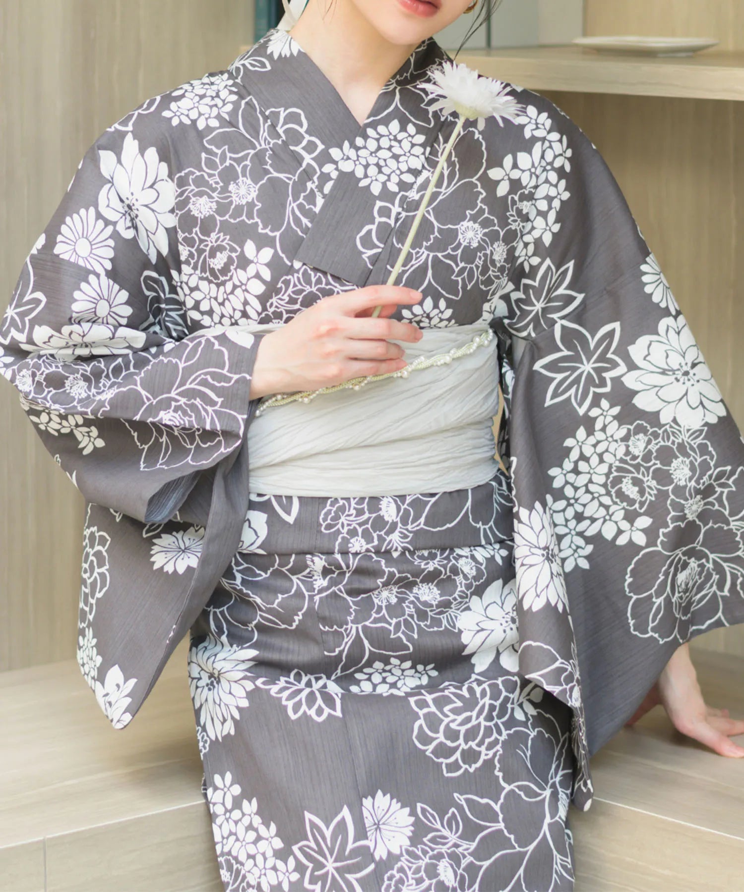 濃いグレー地に白色の菊と芍薬が咲き乱れる、落ち着きのある華やかな浴衣。