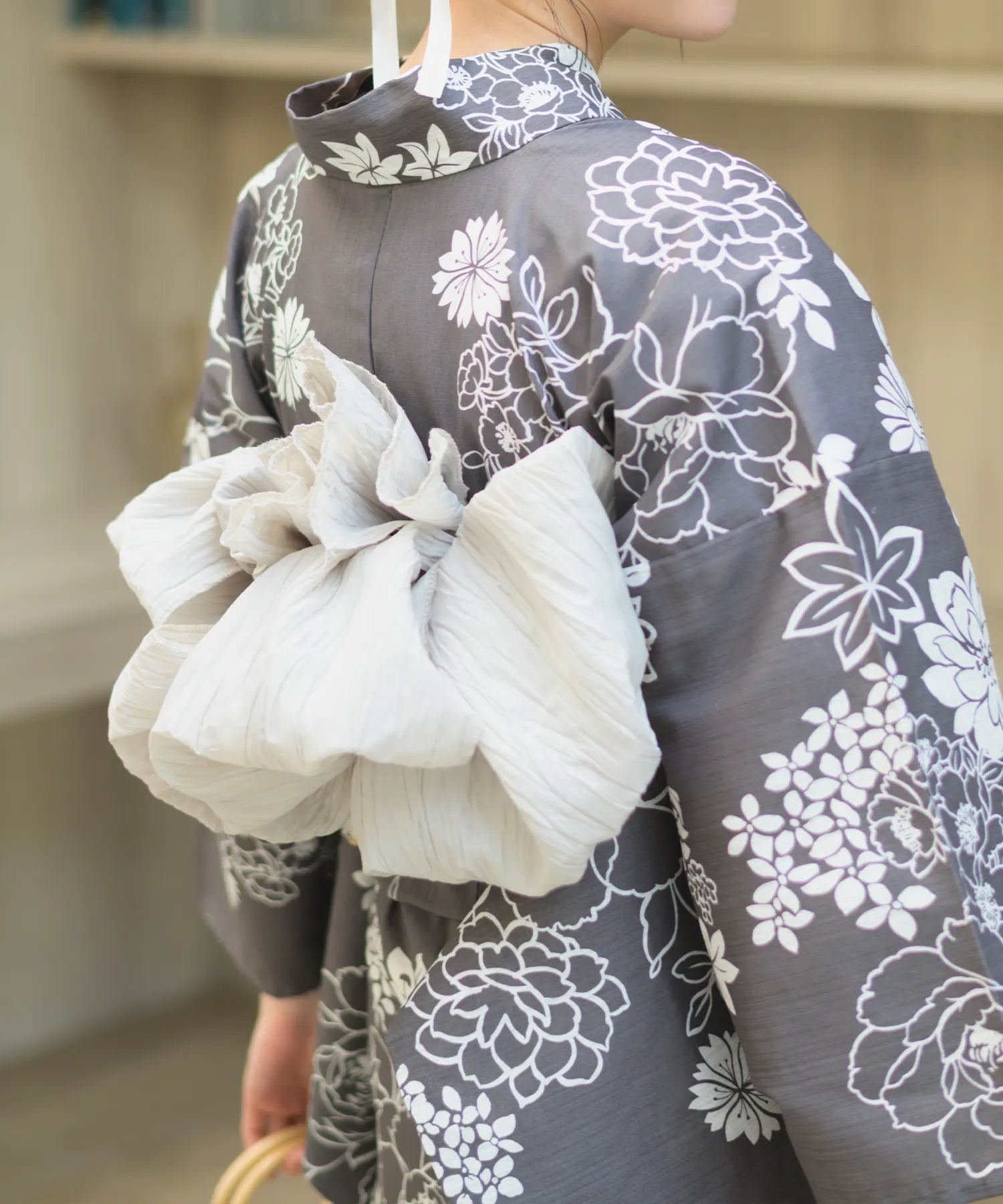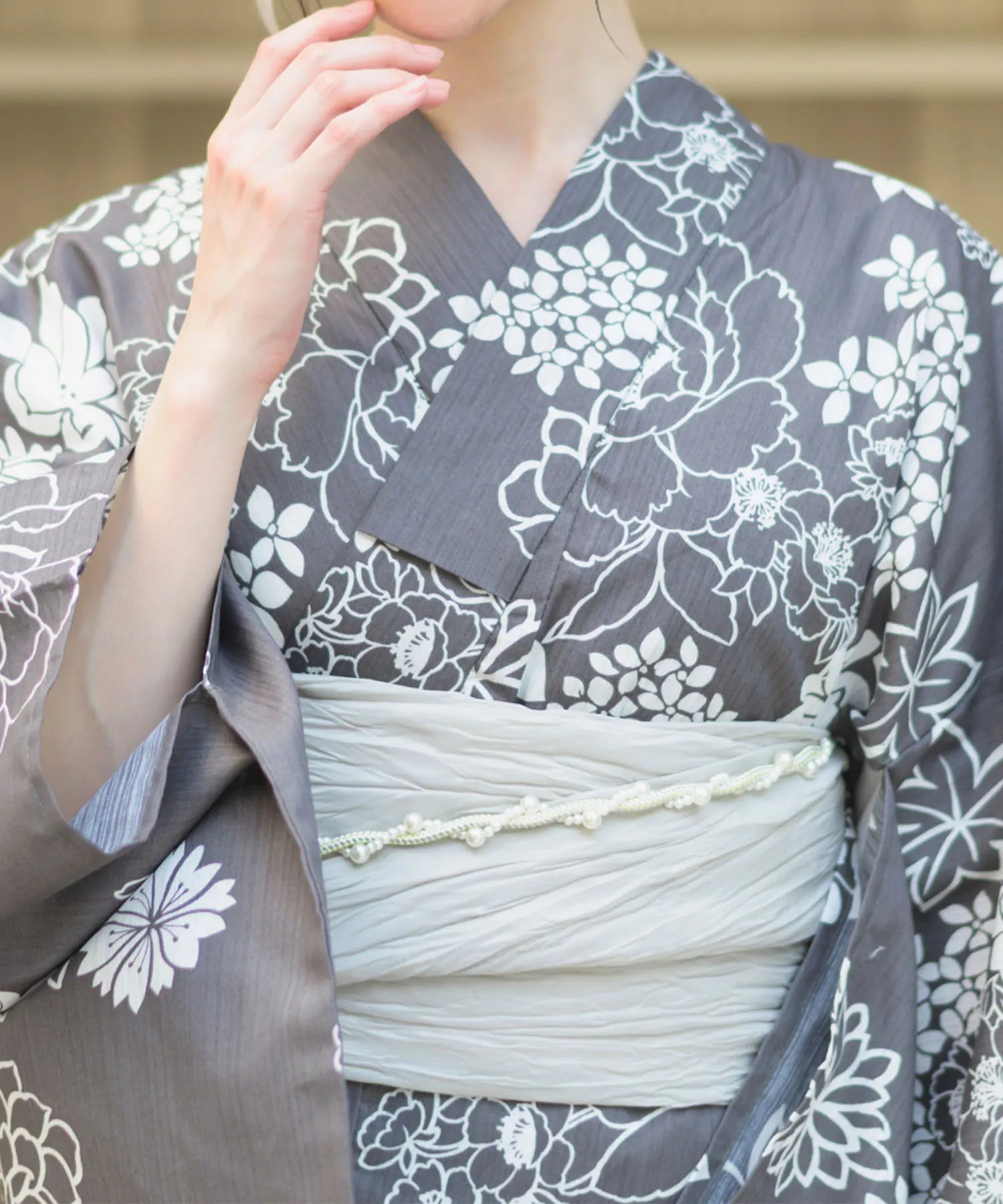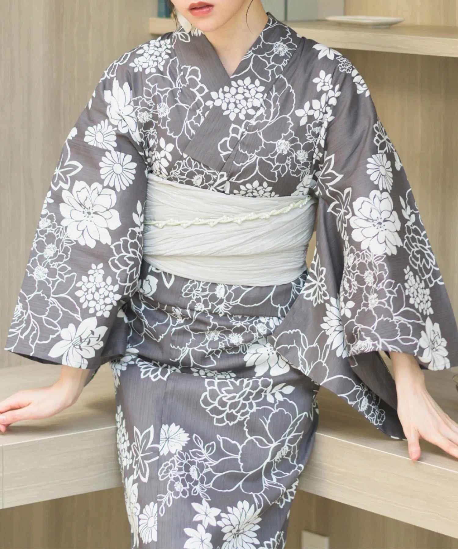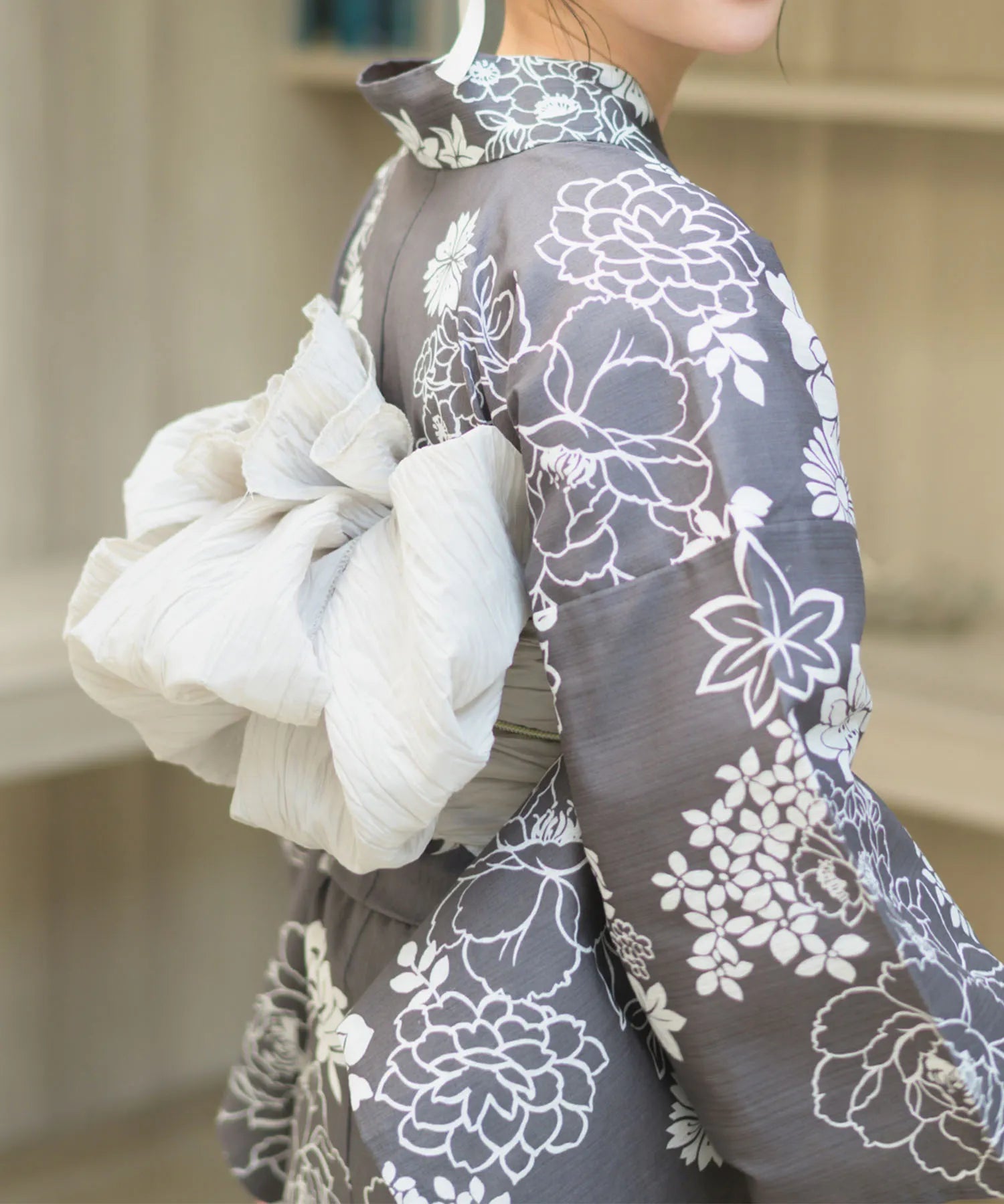 濃いグレー地に白色の菊と芍薬が咲き乱れる、落ち着きのある華やかな浴衣。