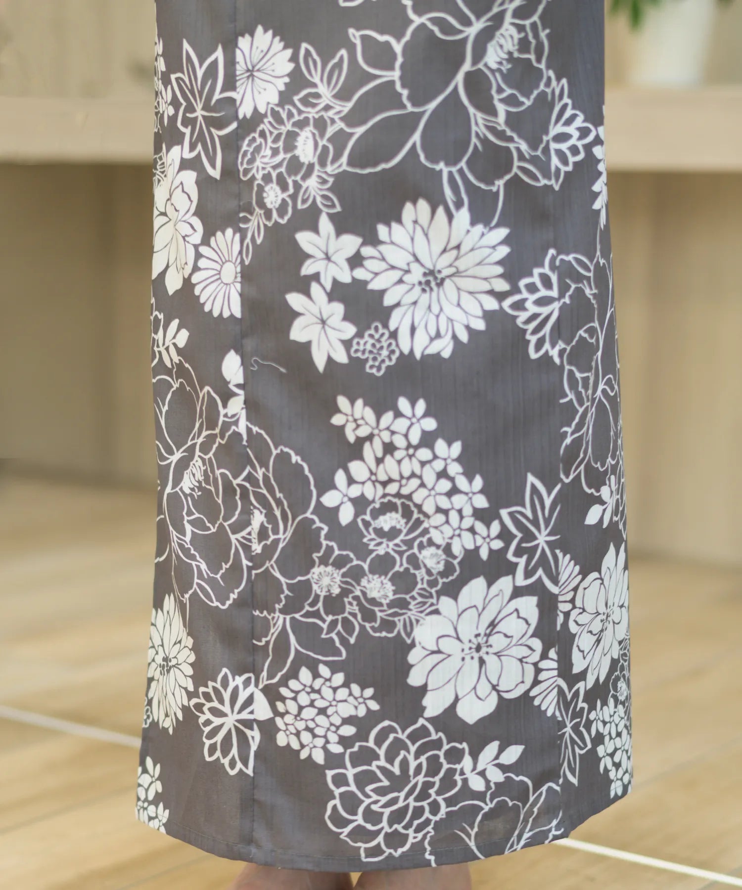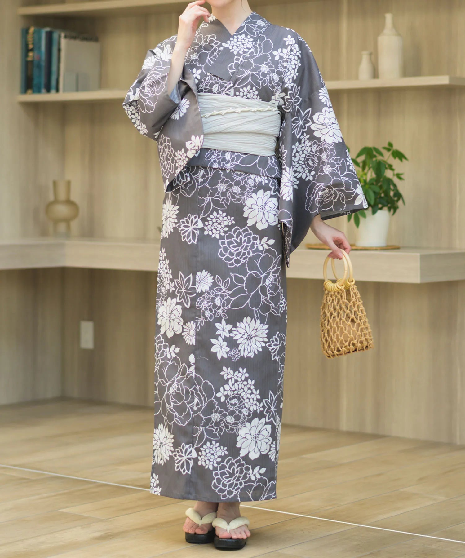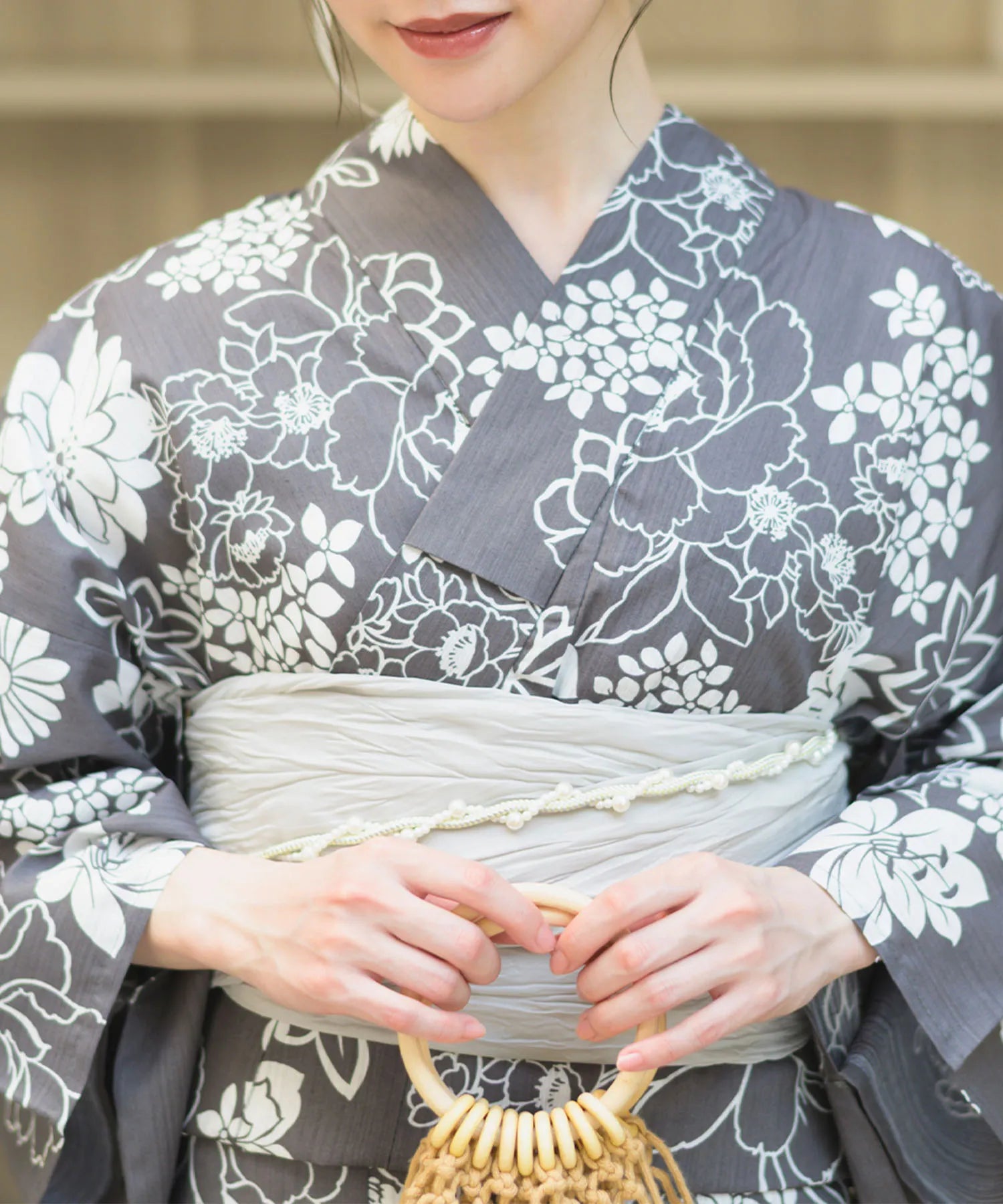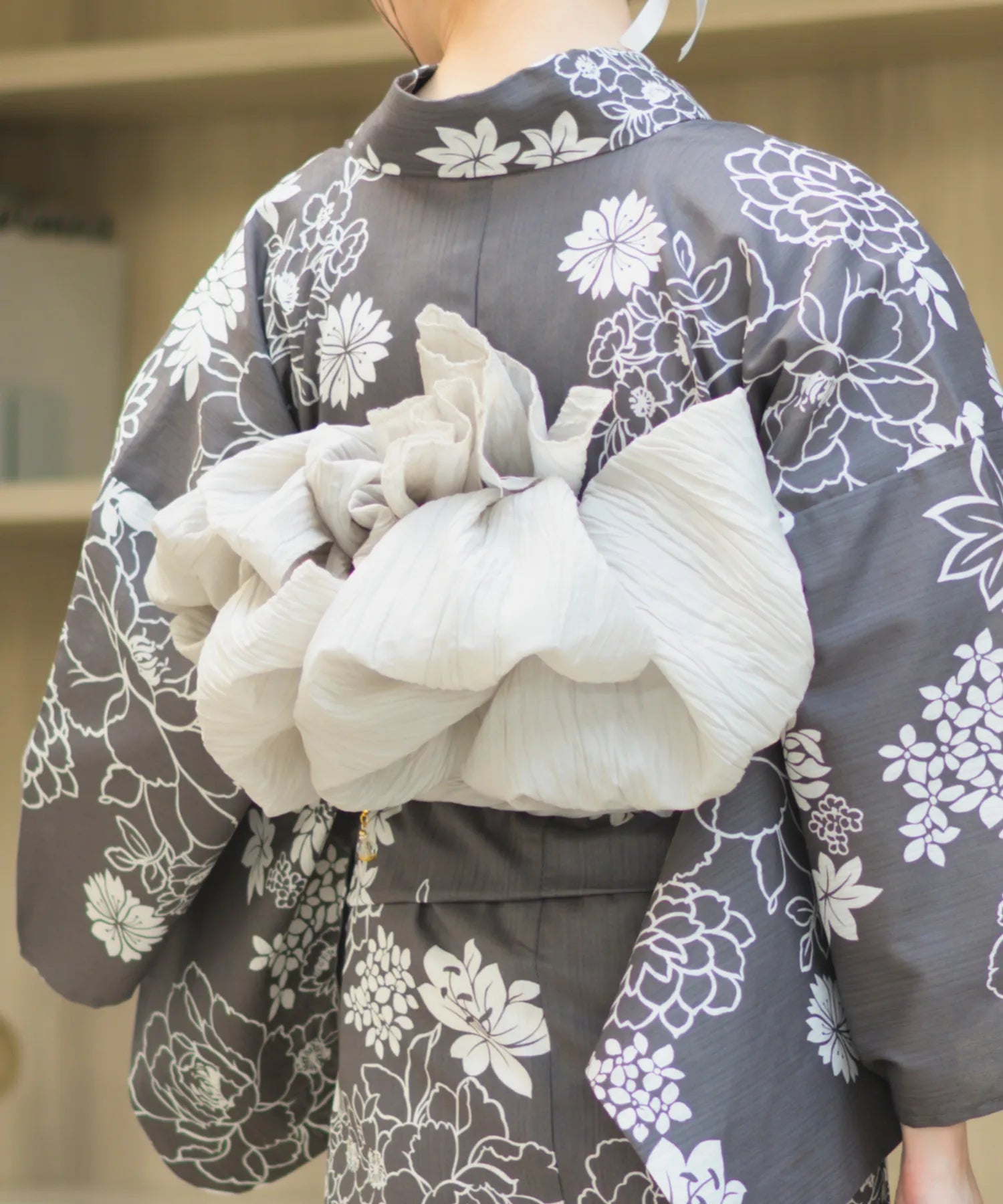 濃いグレー地に白色の菊と芍薬が咲き乱れる、落ち着きのある華やかな浴衣。