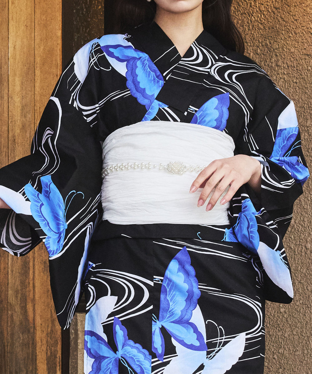 漆黒の夜空に幸せを運ぶ青い蝶・ユリシスが幻想的に舞う浴衣。