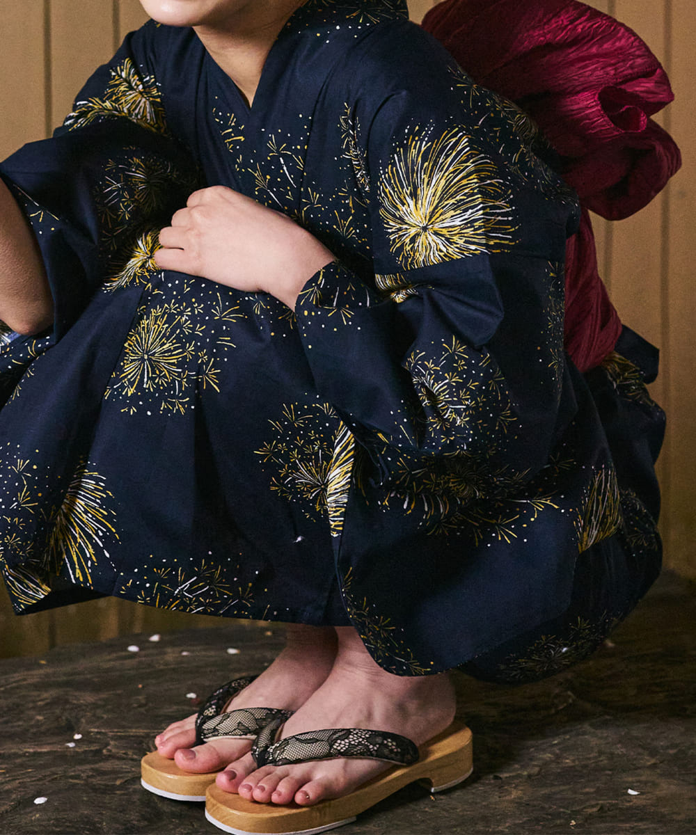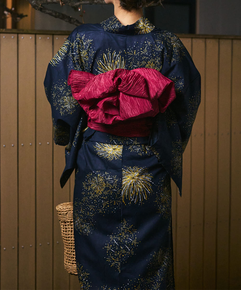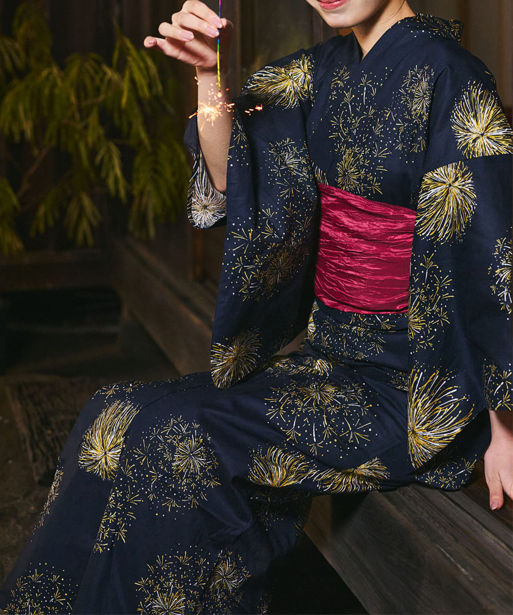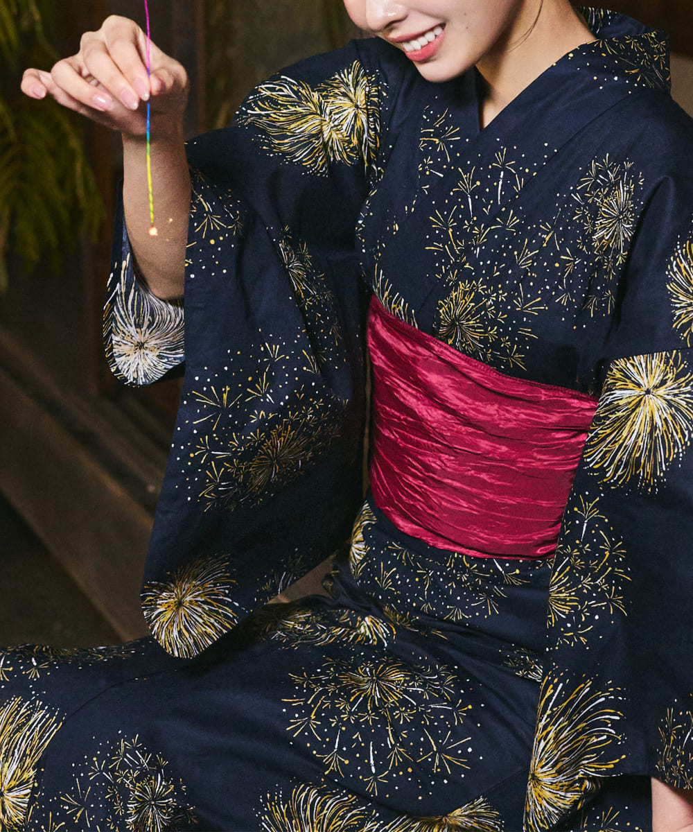 深い紺色の夜空に、一瞬の輝きを刻む花火が大きく咲き乱れる浴衣。