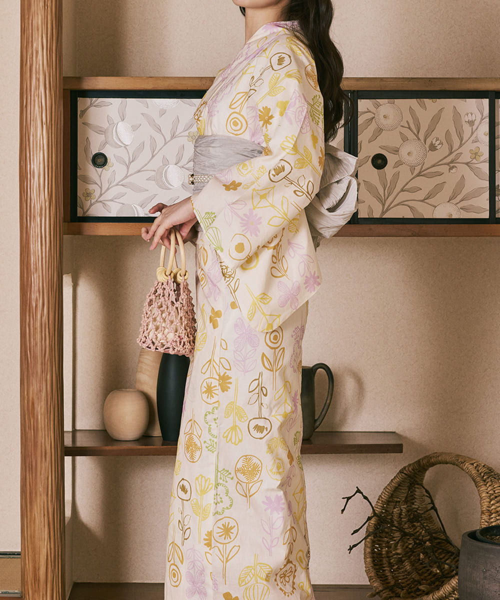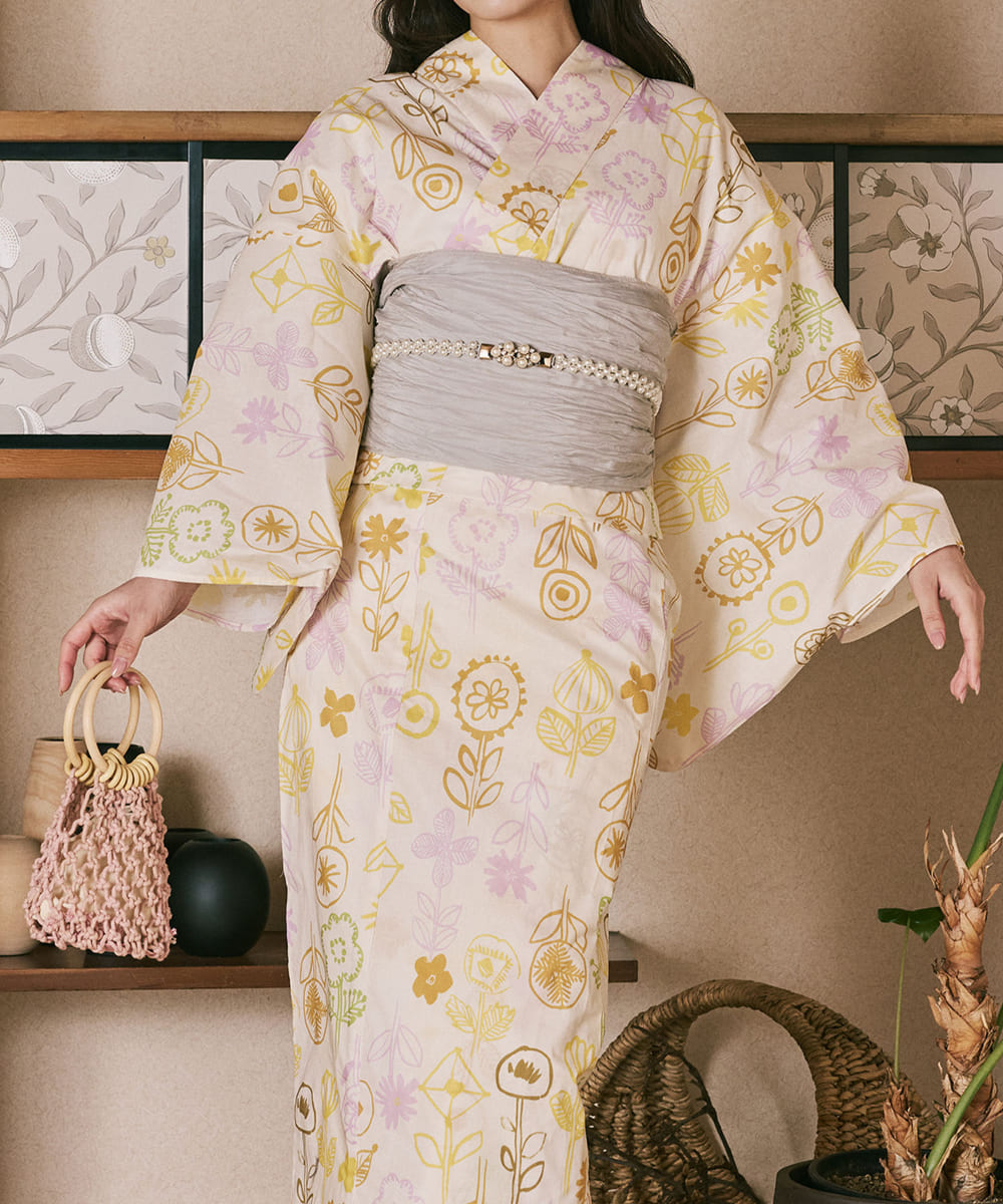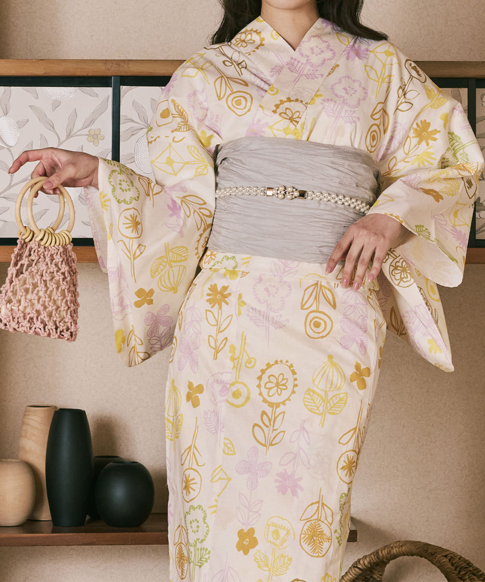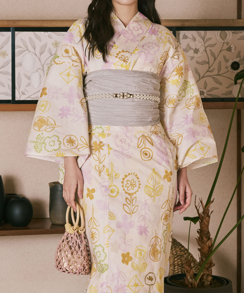 クリーム色の地に可愛らしい暖色の北欧柄が広がる、個性的でキュートな浴衣。