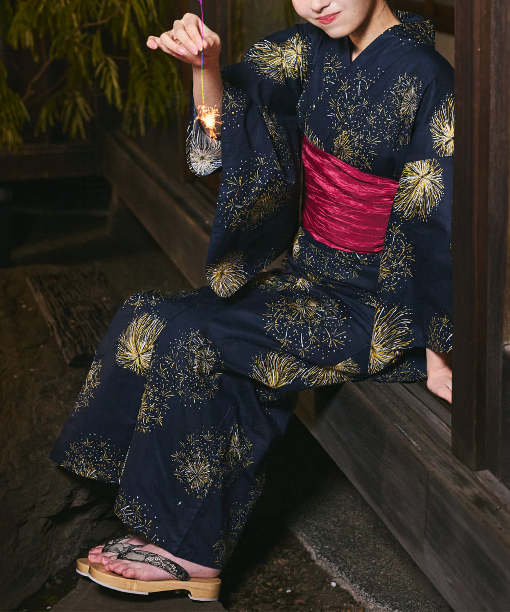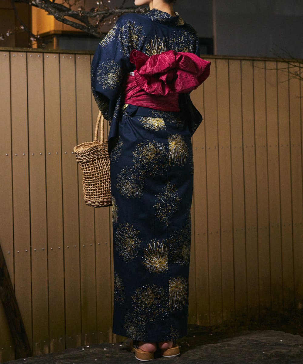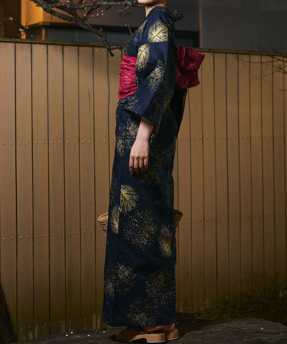 深い紺色の夜空に、一瞬の輝きを刻む花火が大きく咲き乱れる浴衣。
