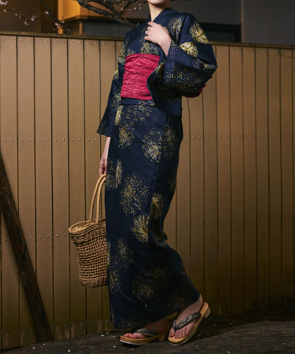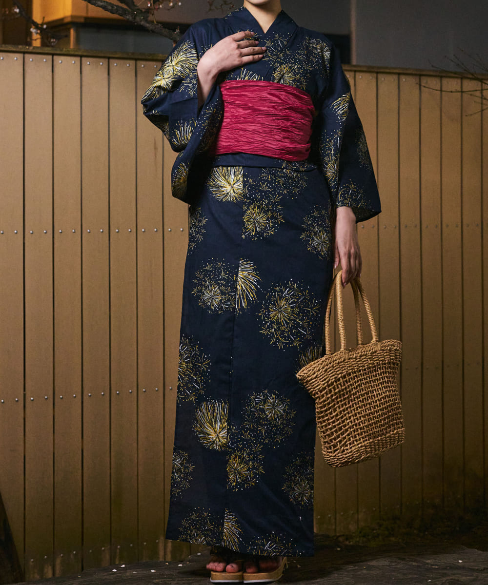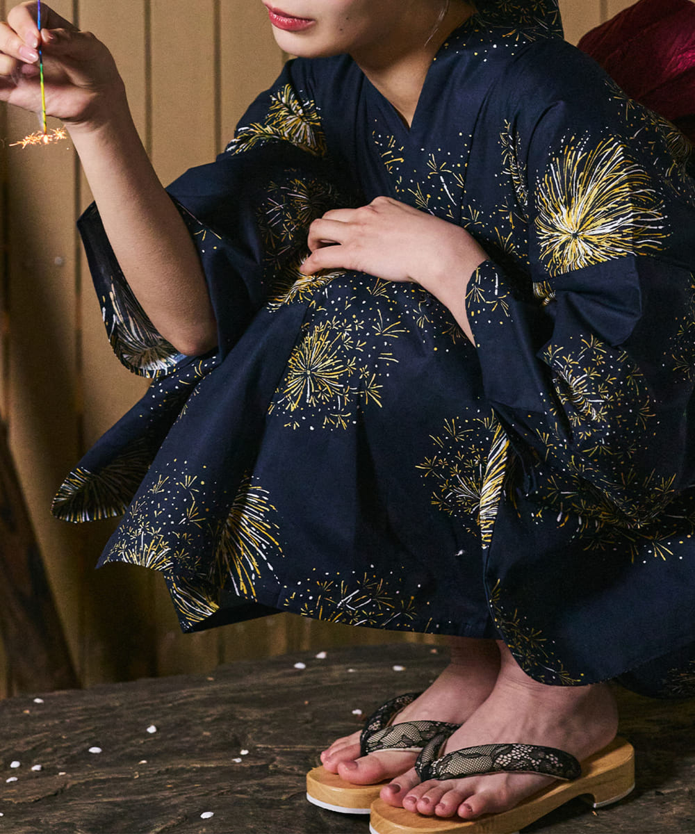 深い紺色の夜空に、一瞬の輝きを刻む花火が大きく咲き乱れる浴衣。