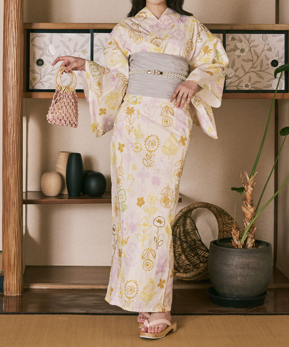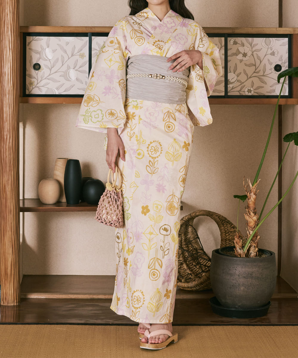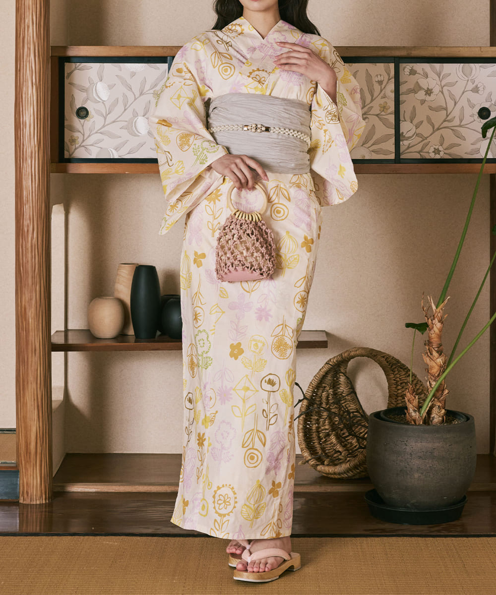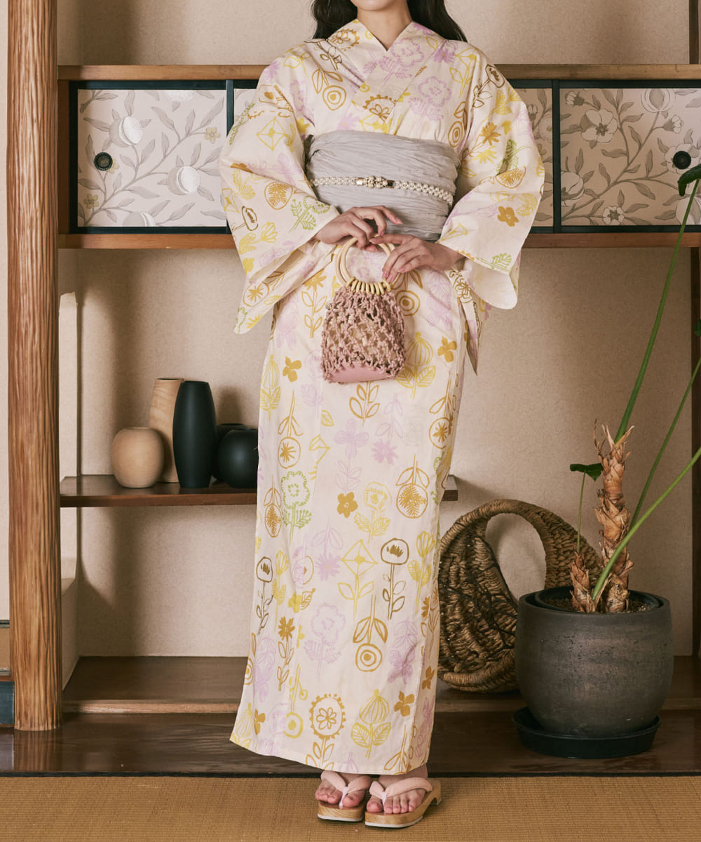 クリーム色の地に可愛らしい暖色の北欧柄が広がる、個性的でキュートな浴衣。