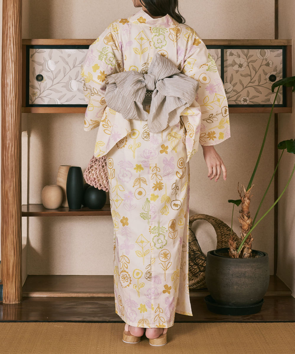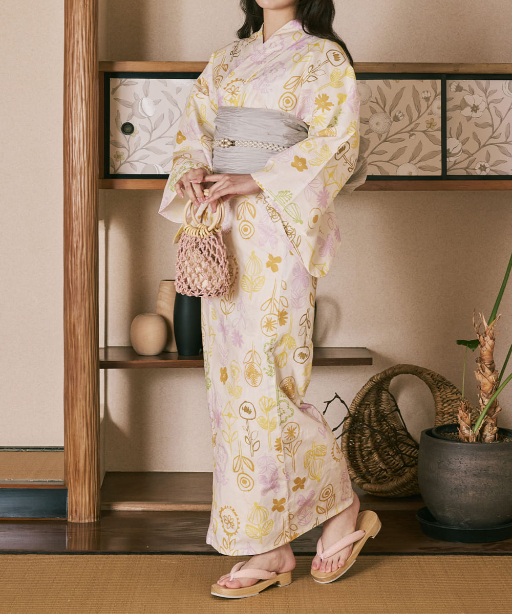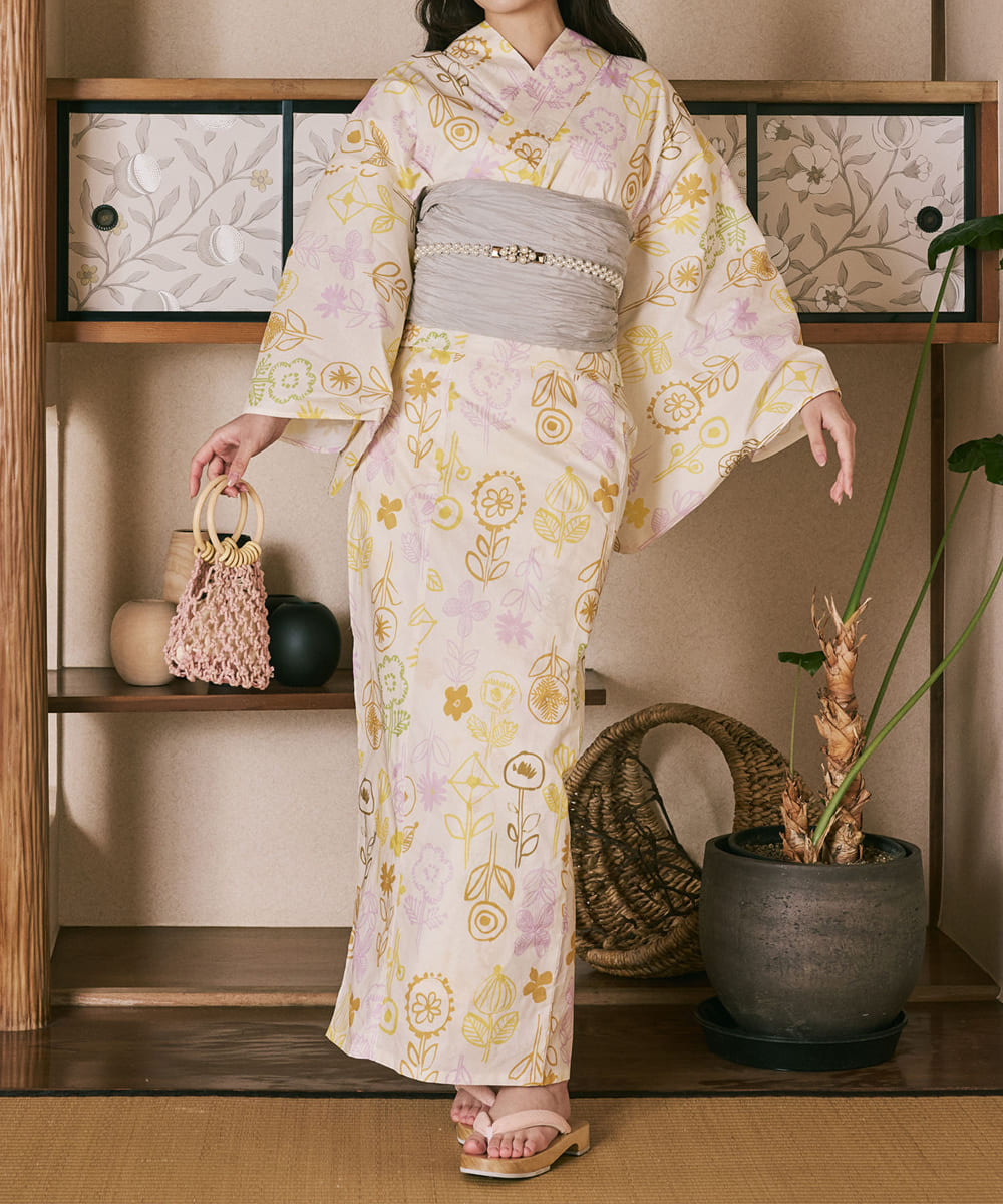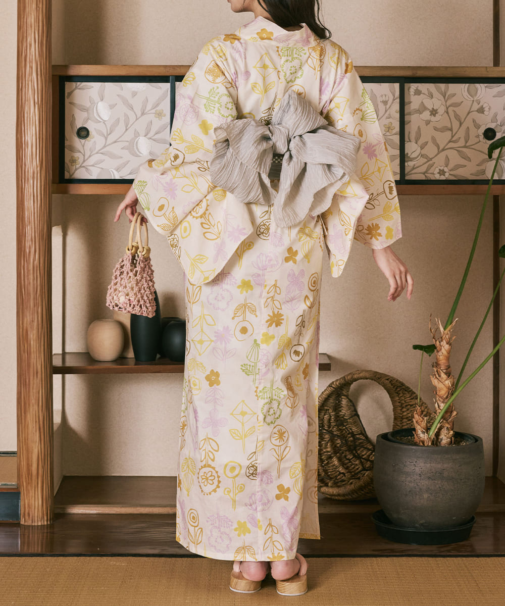 クリーム色の地に可愛らしい暖色の北欧柄が広がる、個性的でキュートな浴衣。