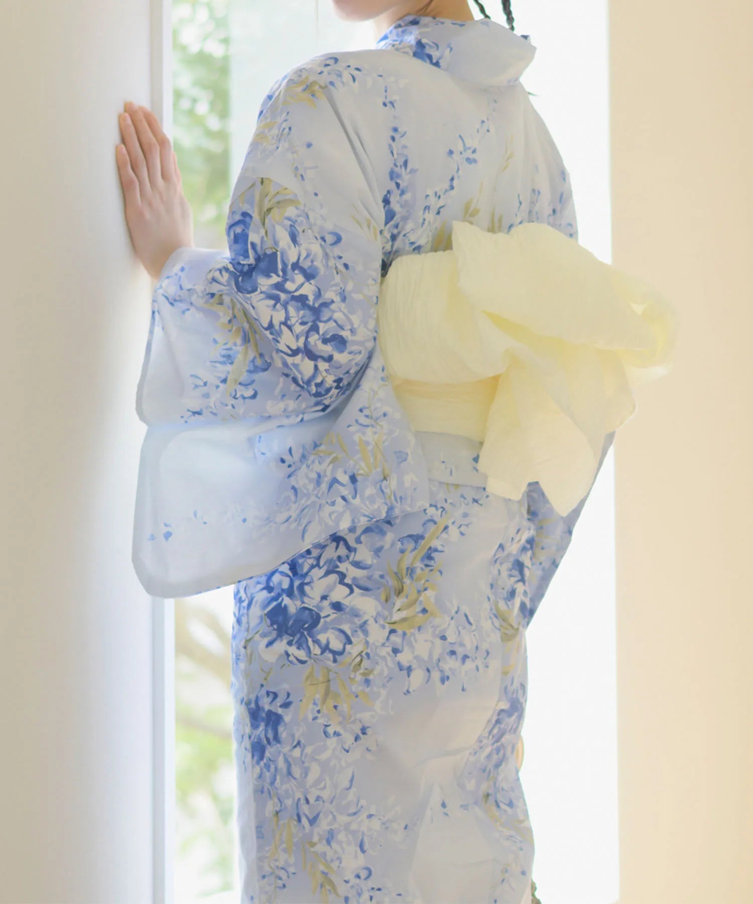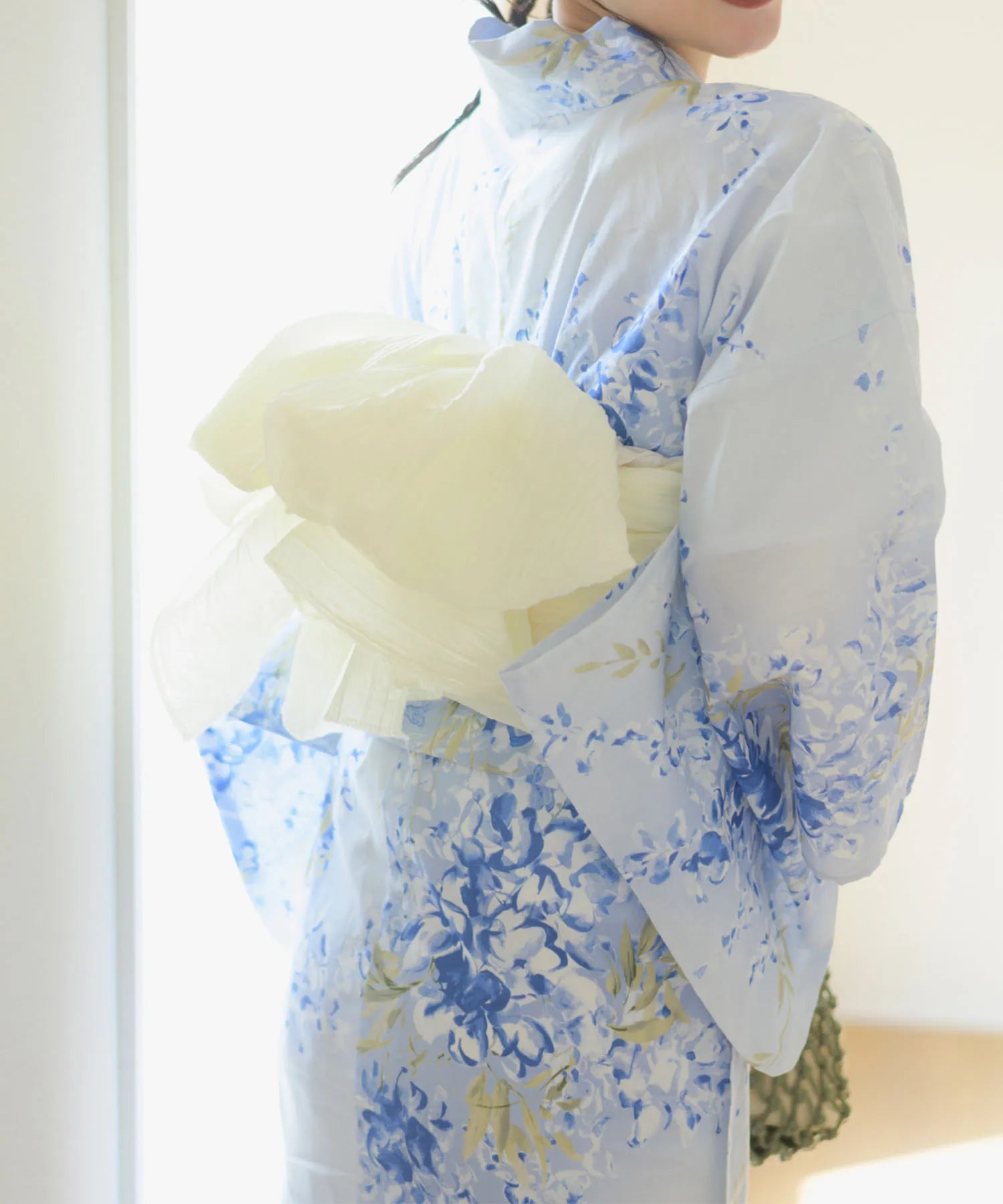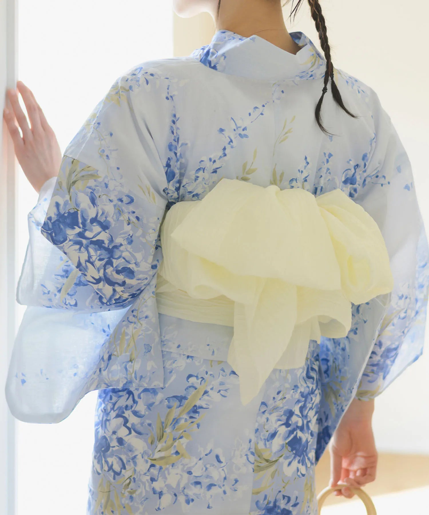 グラデーションがかった淡い水色の地に、風にそよぐ藤の花が描かれた涼やかな浴衣。