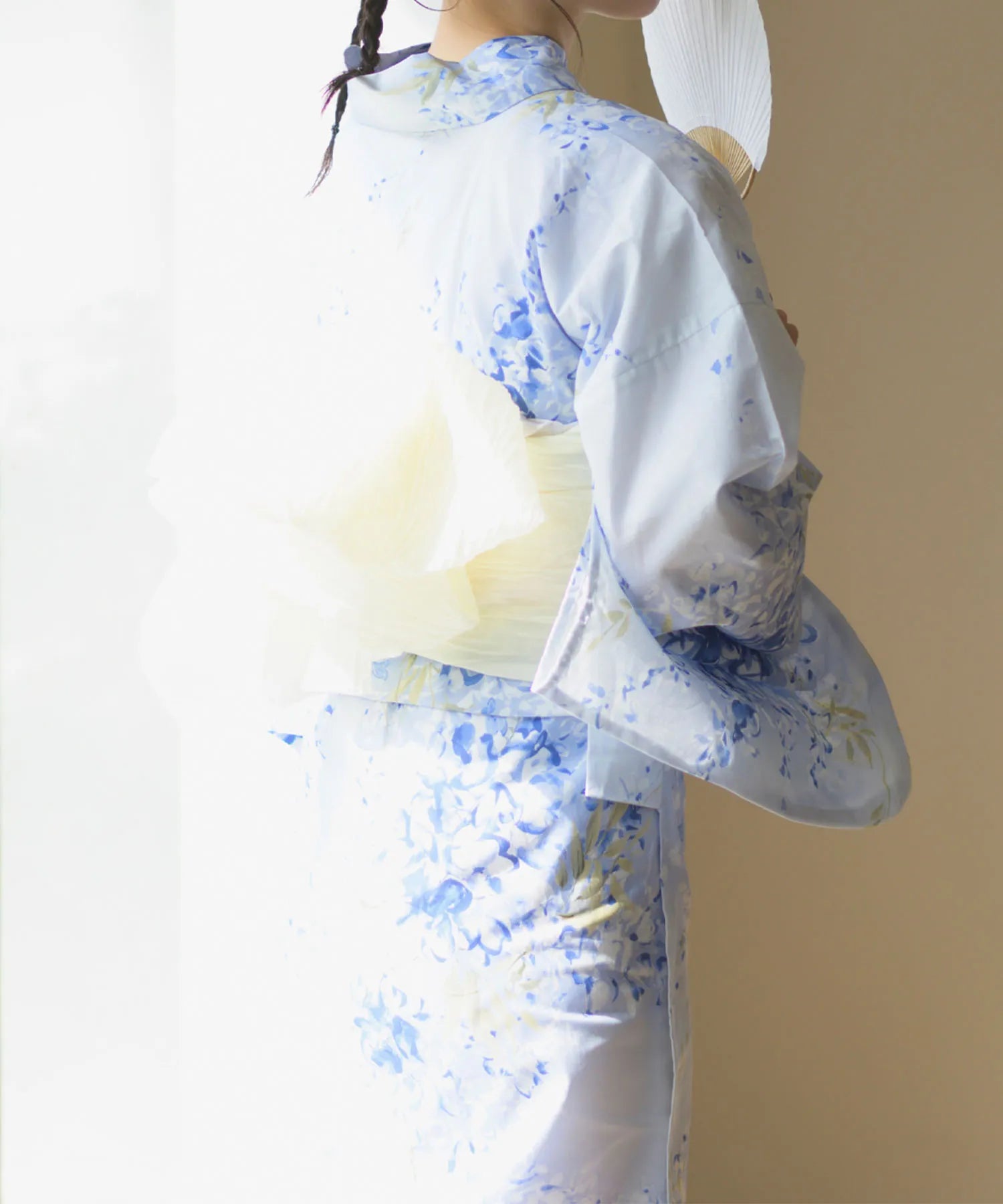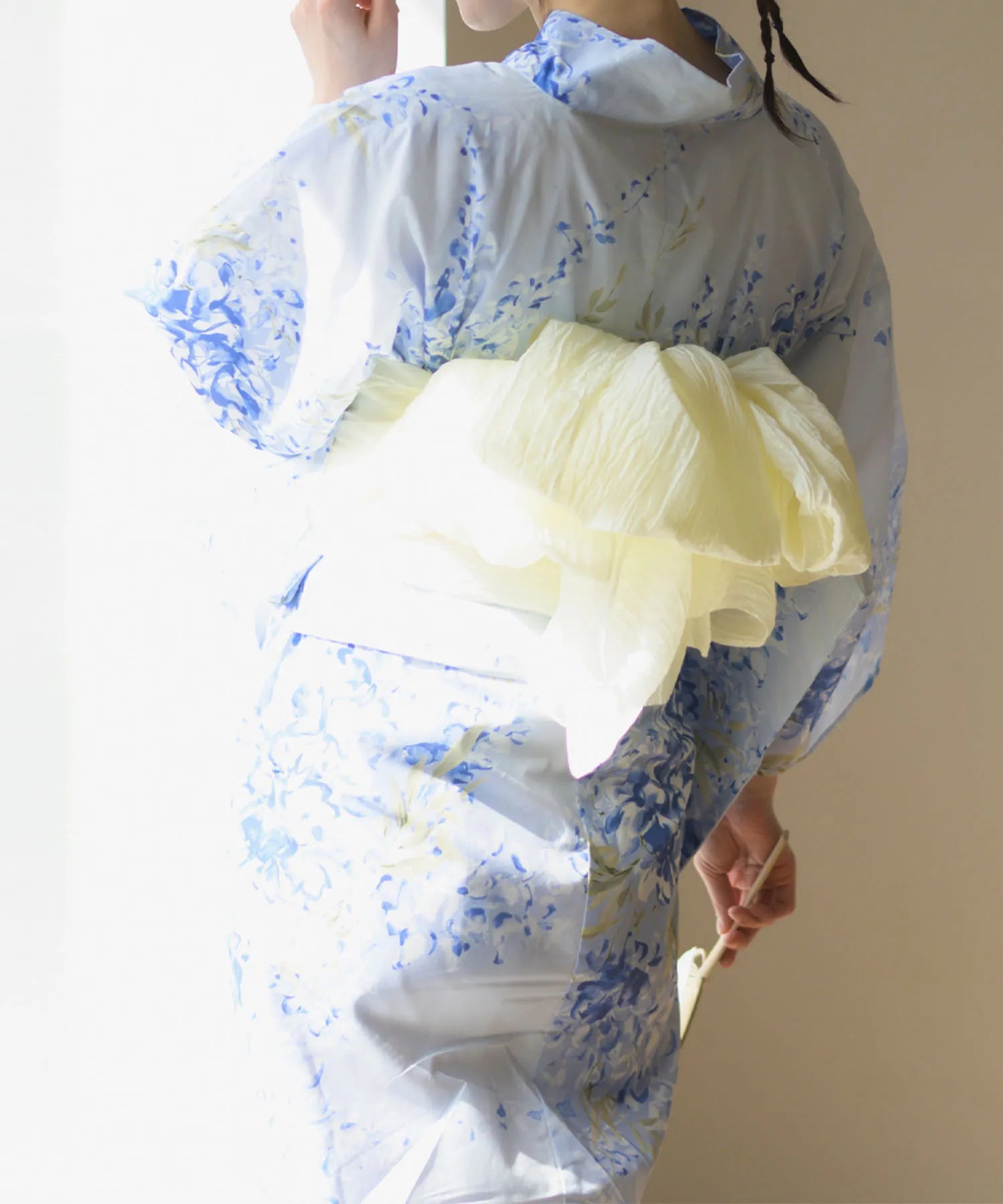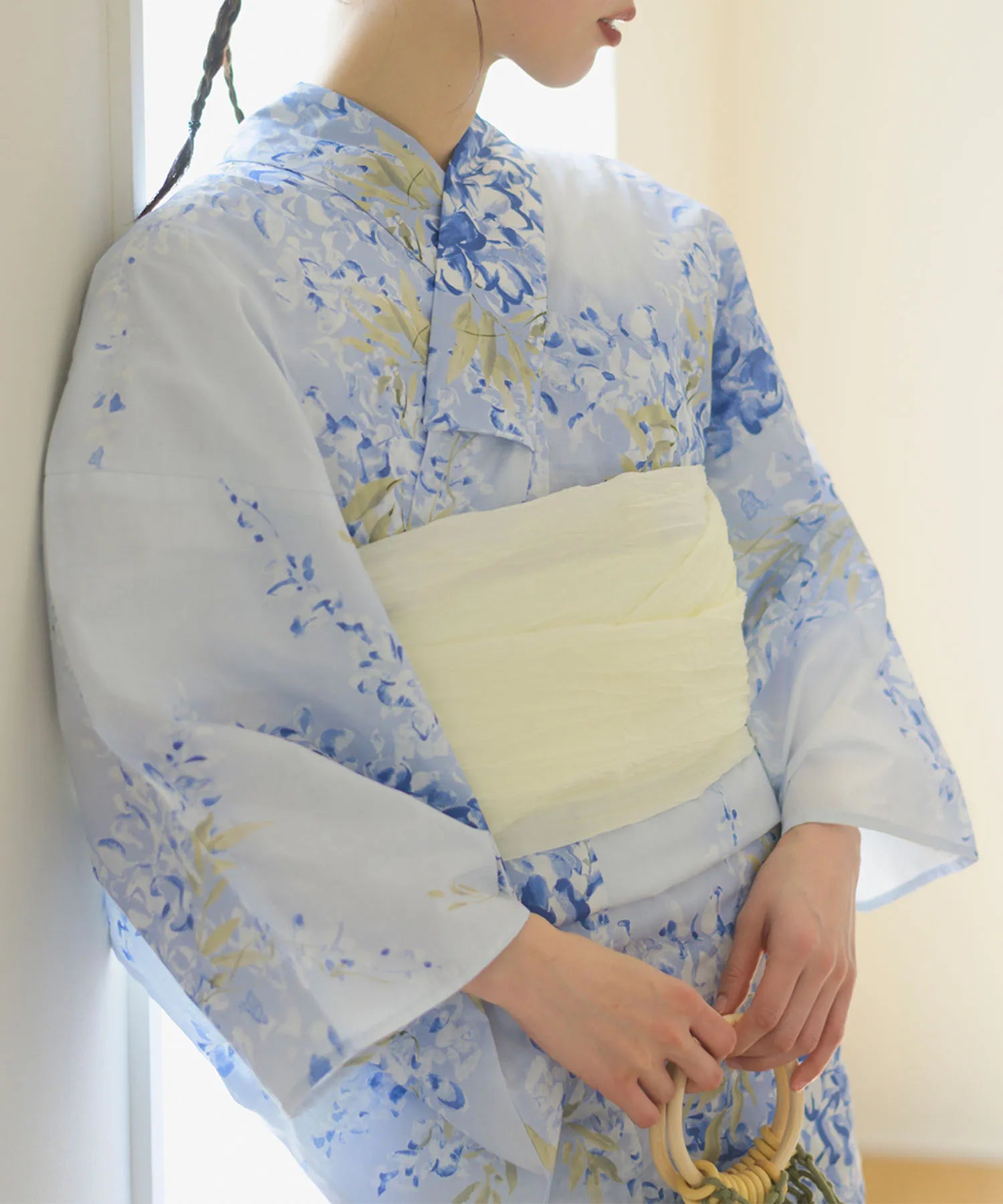 グラデーションがかった淡い水色の地に、風にそよぐ藤の花が描かれた涼やかな浴衣。
