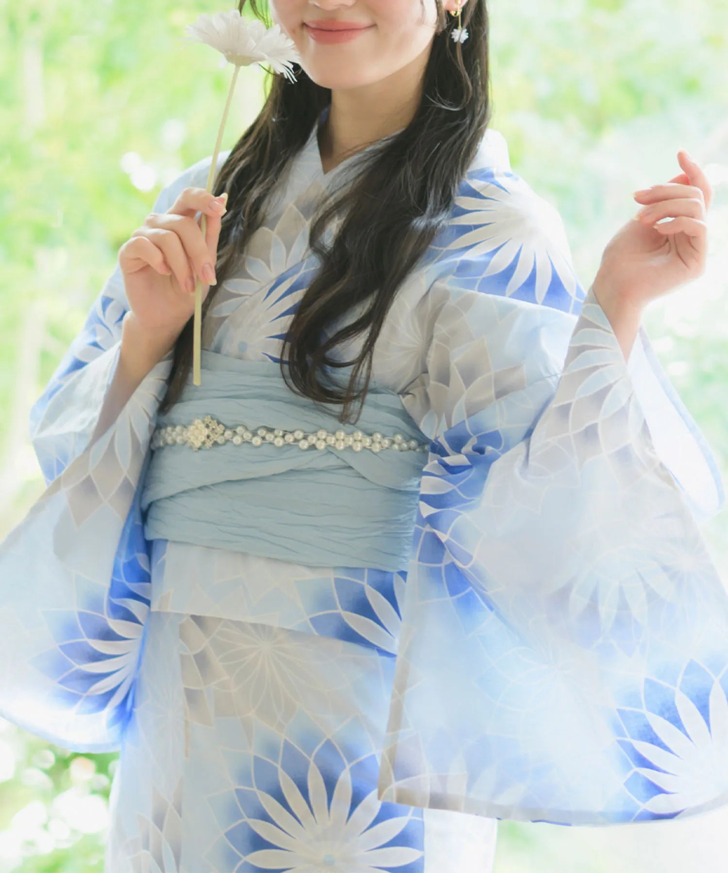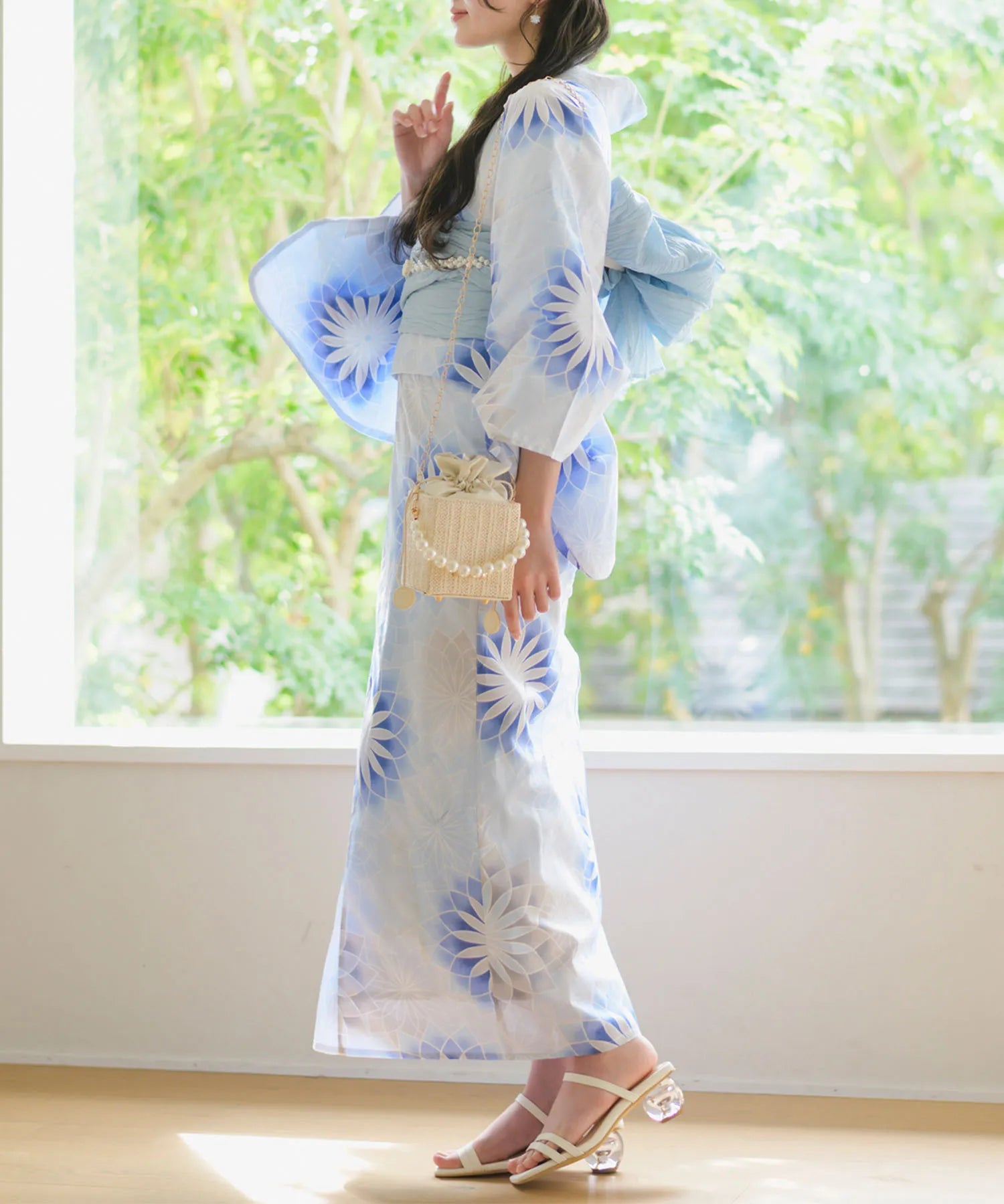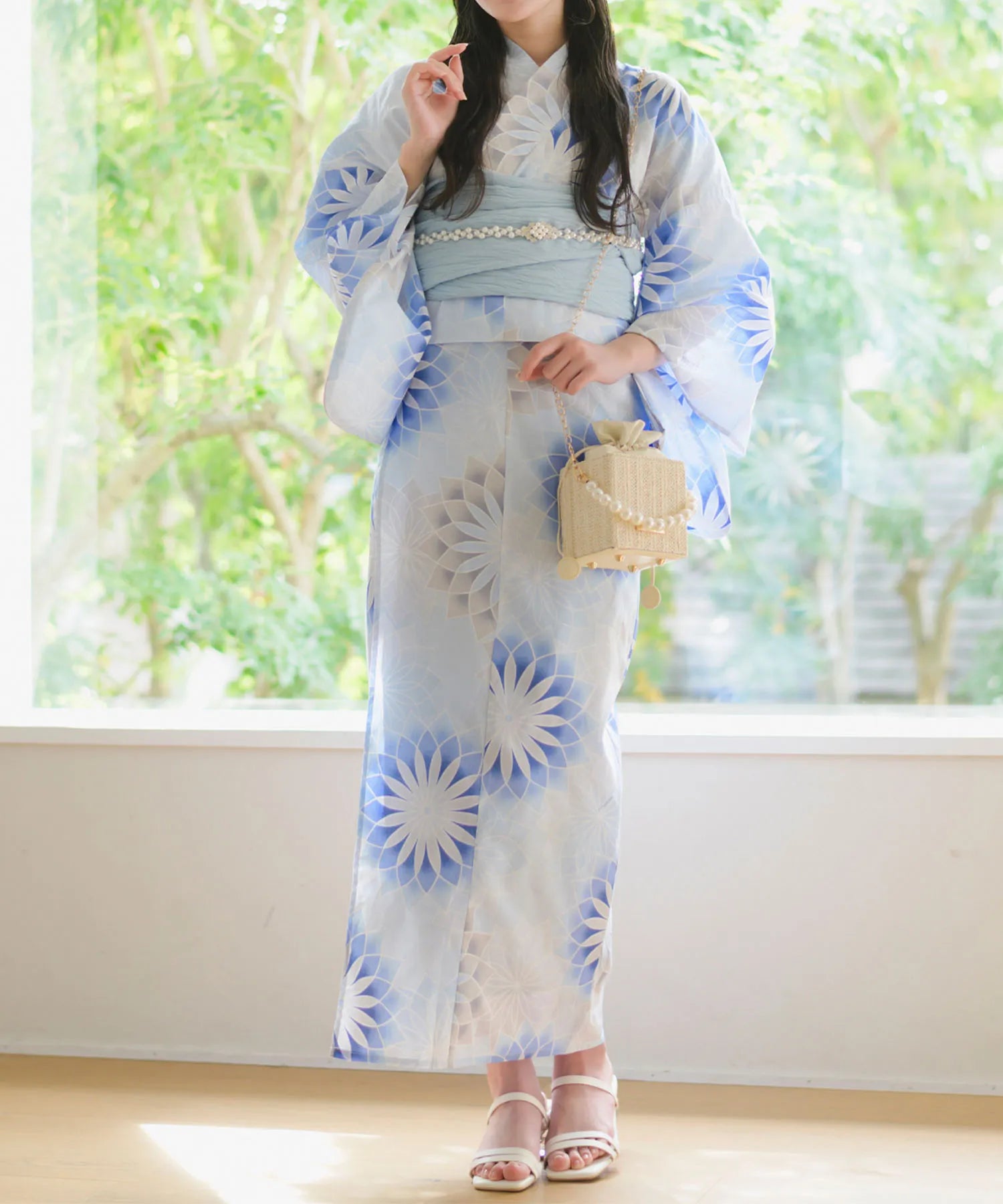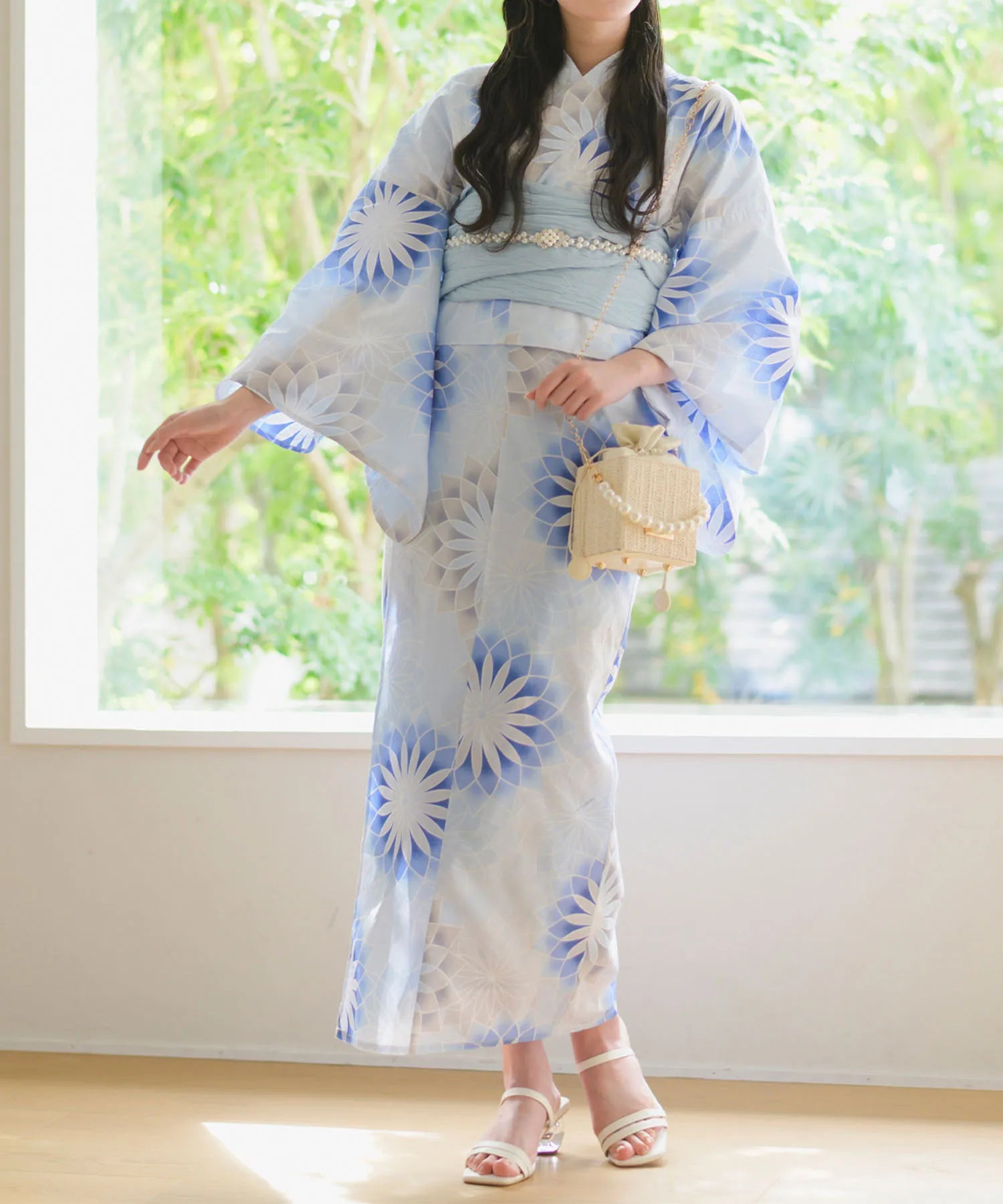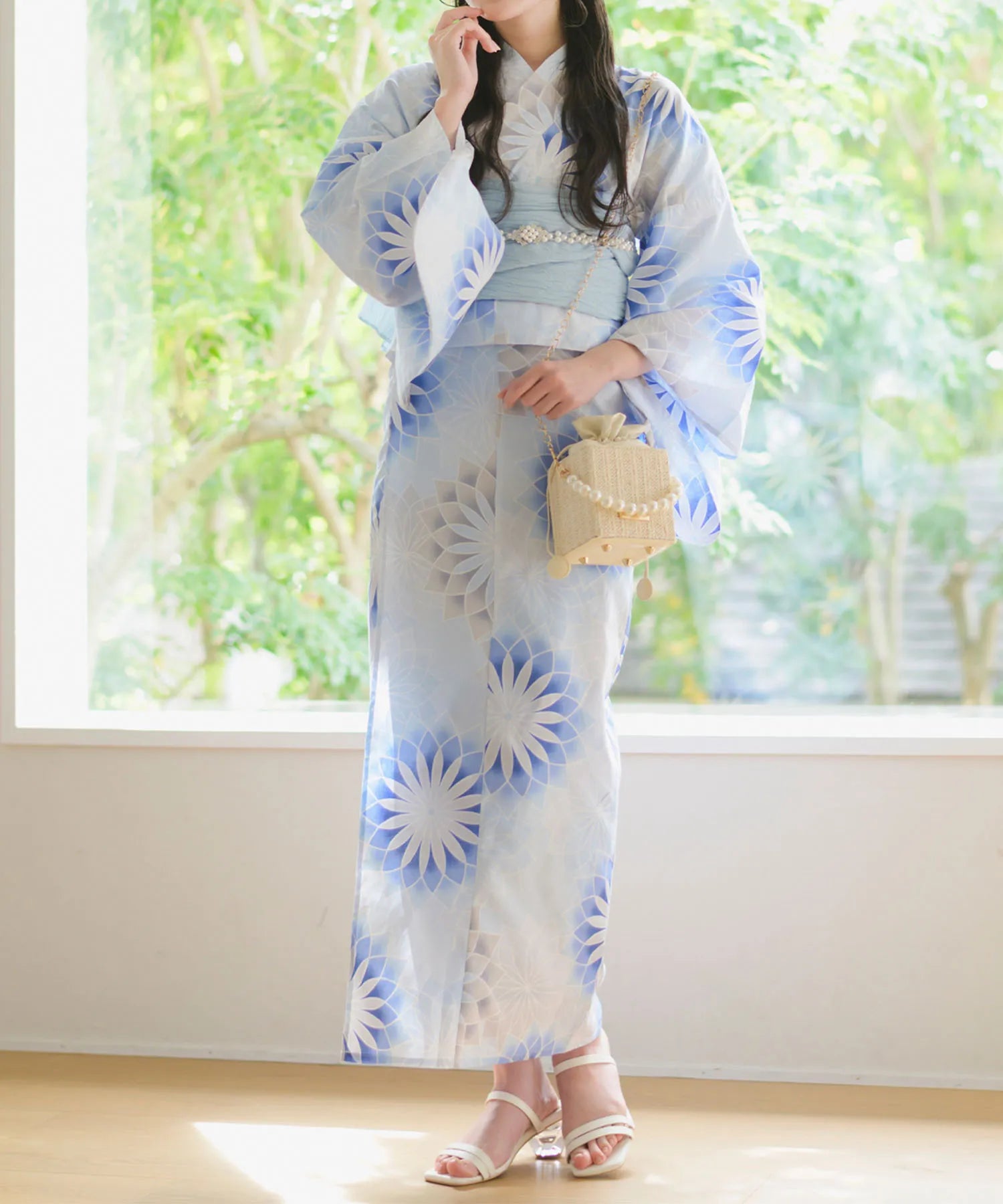 爽やかな水色の地に菊の花が万華鏡のように広がる幻想的な浴衣。