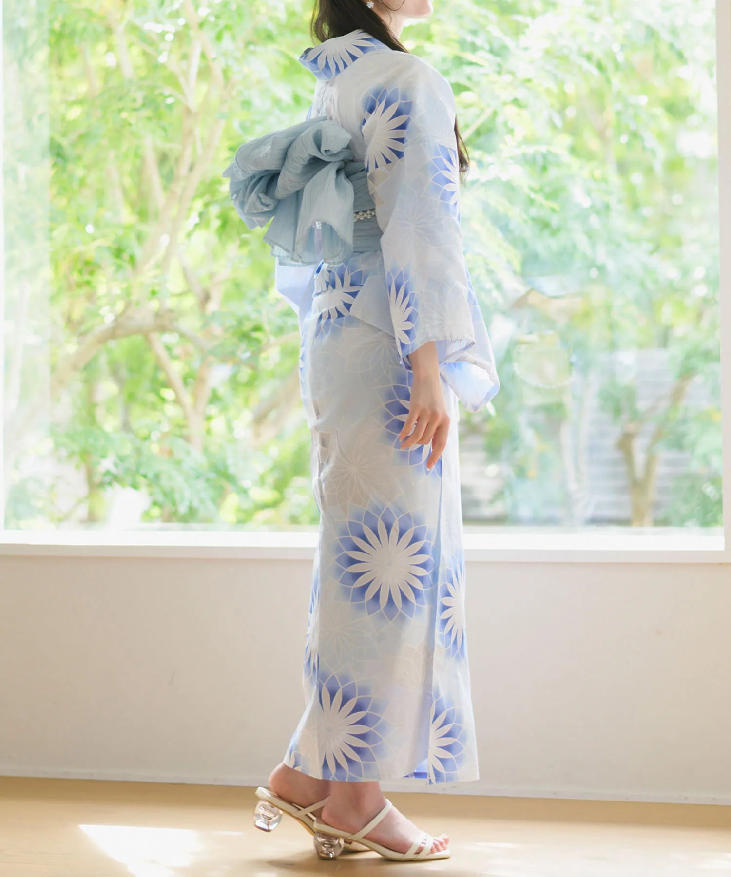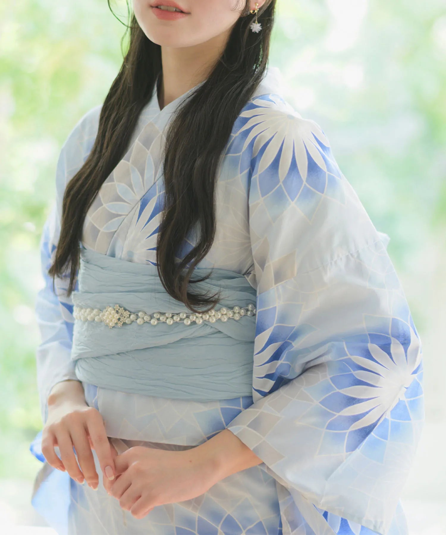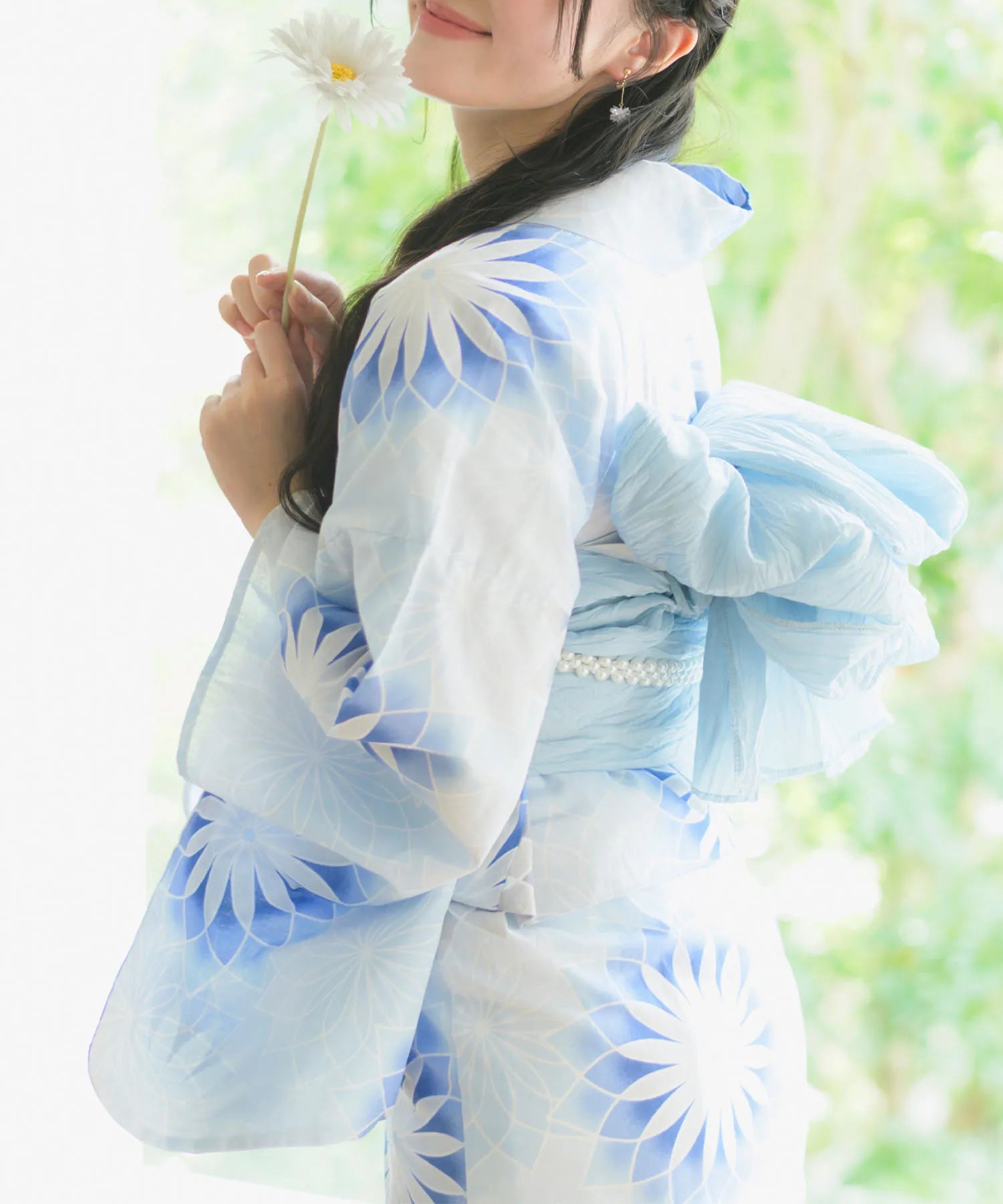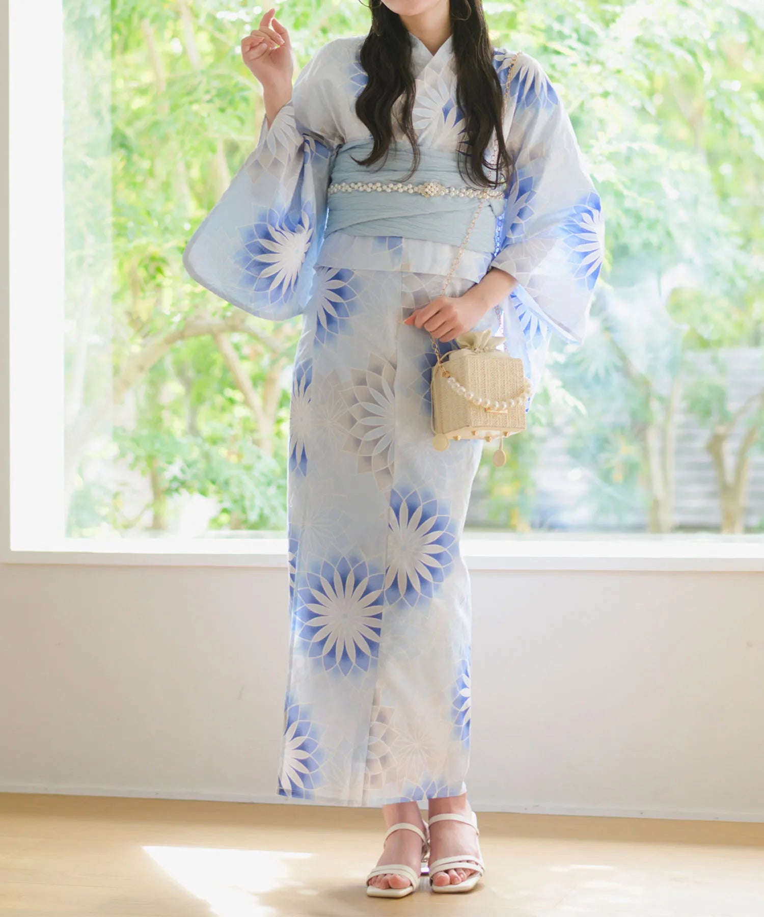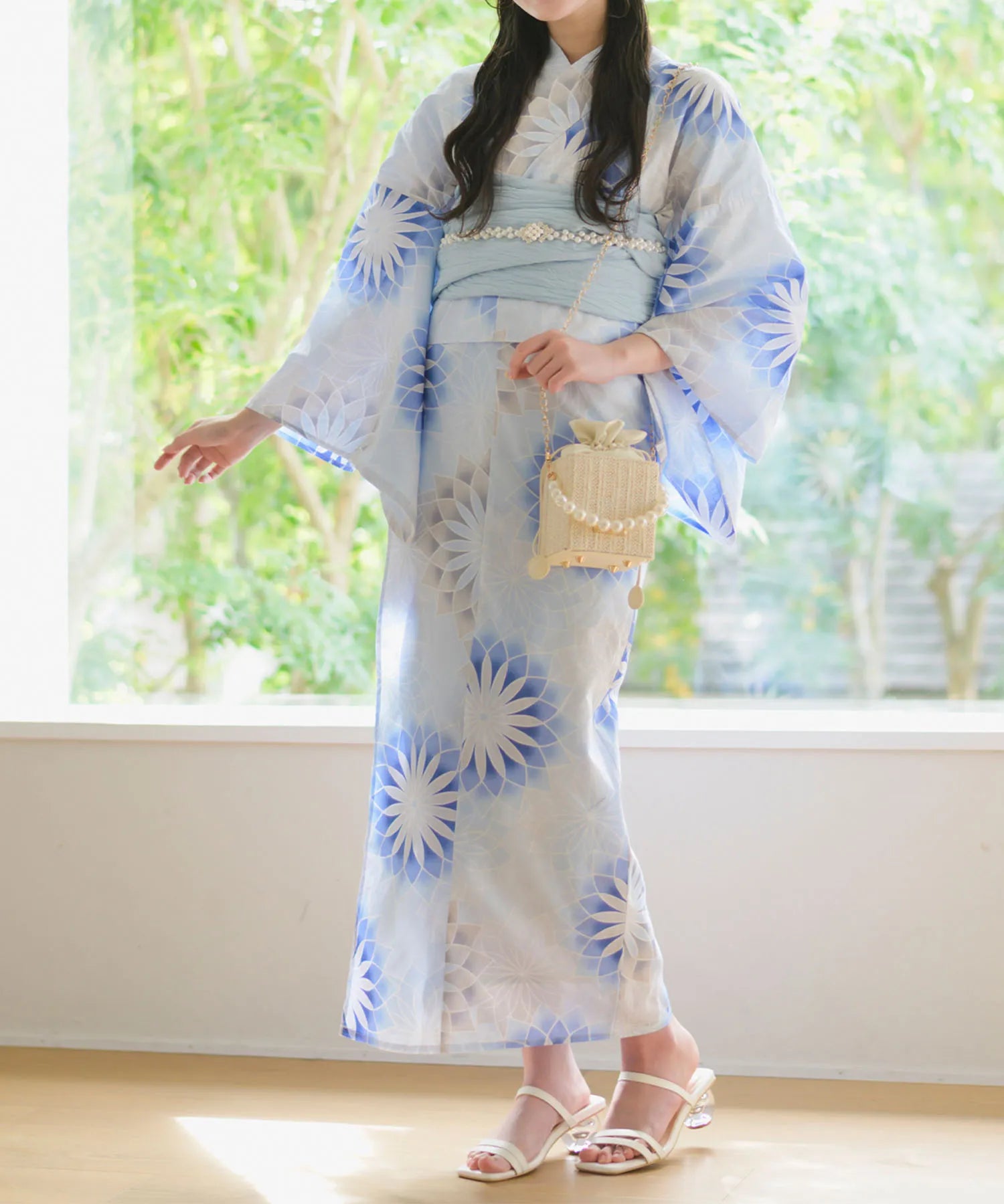 爽やかな水色の地に菊の花が万華鏡のように広がる幻想的な浴衣。