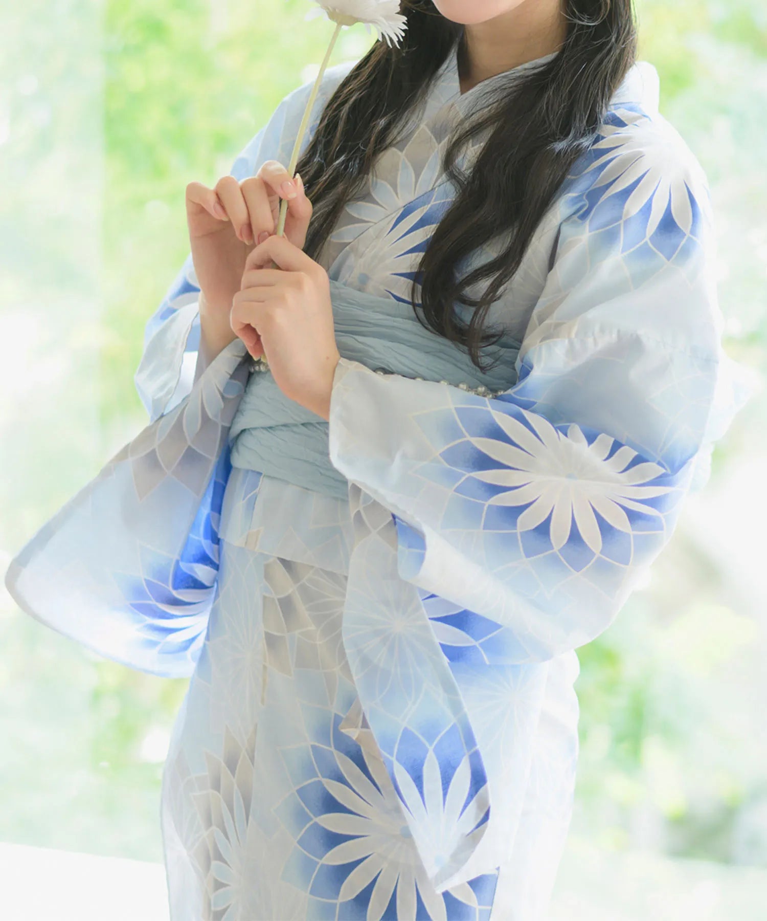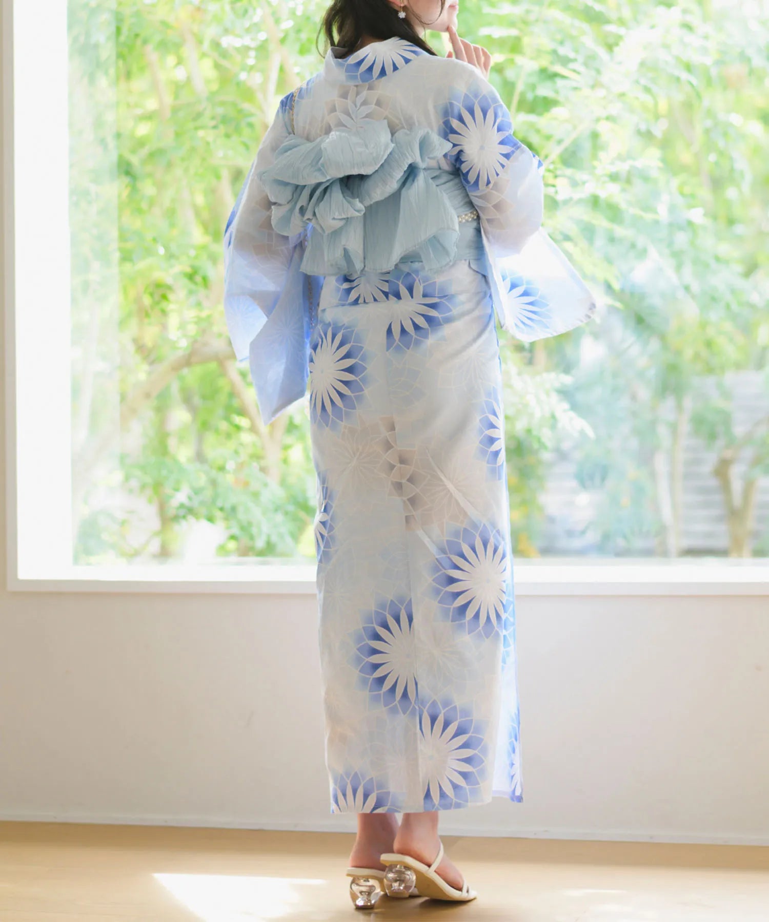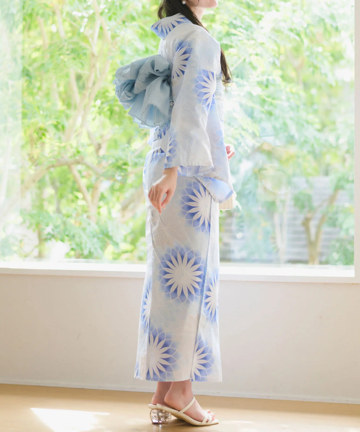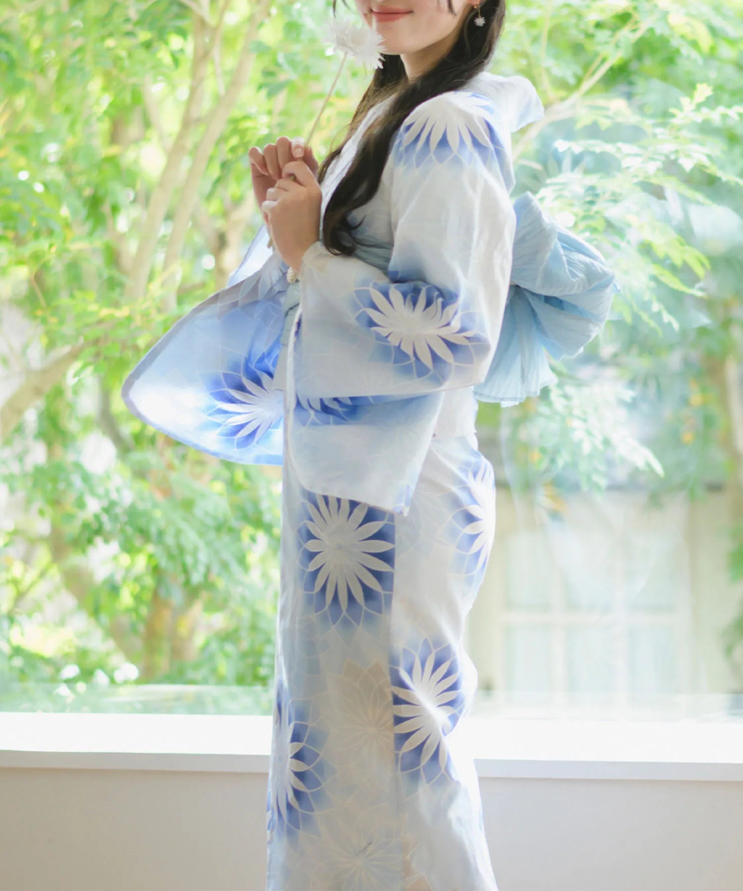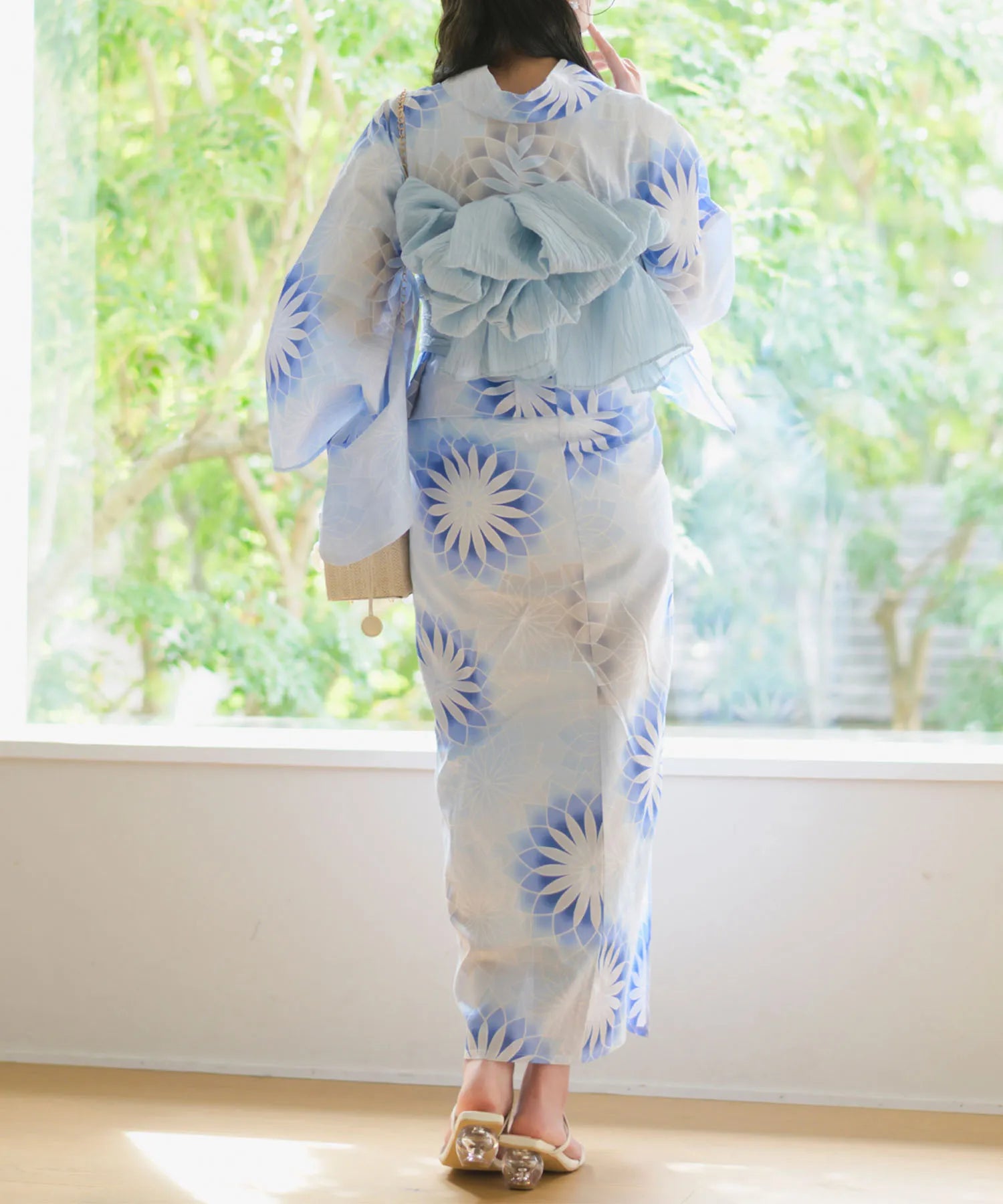 爽やかな水色の地に菊の花が万華鏡のように広がる幻想的な浴衣。