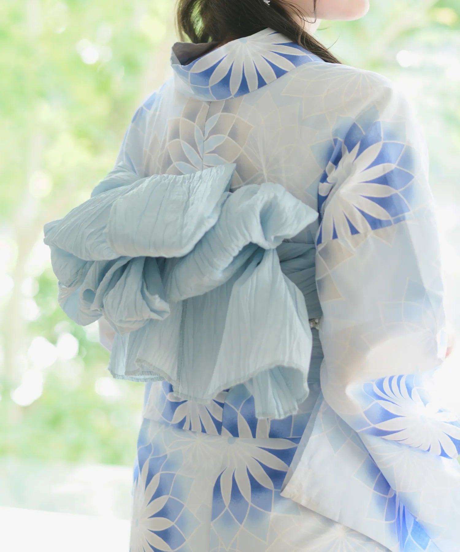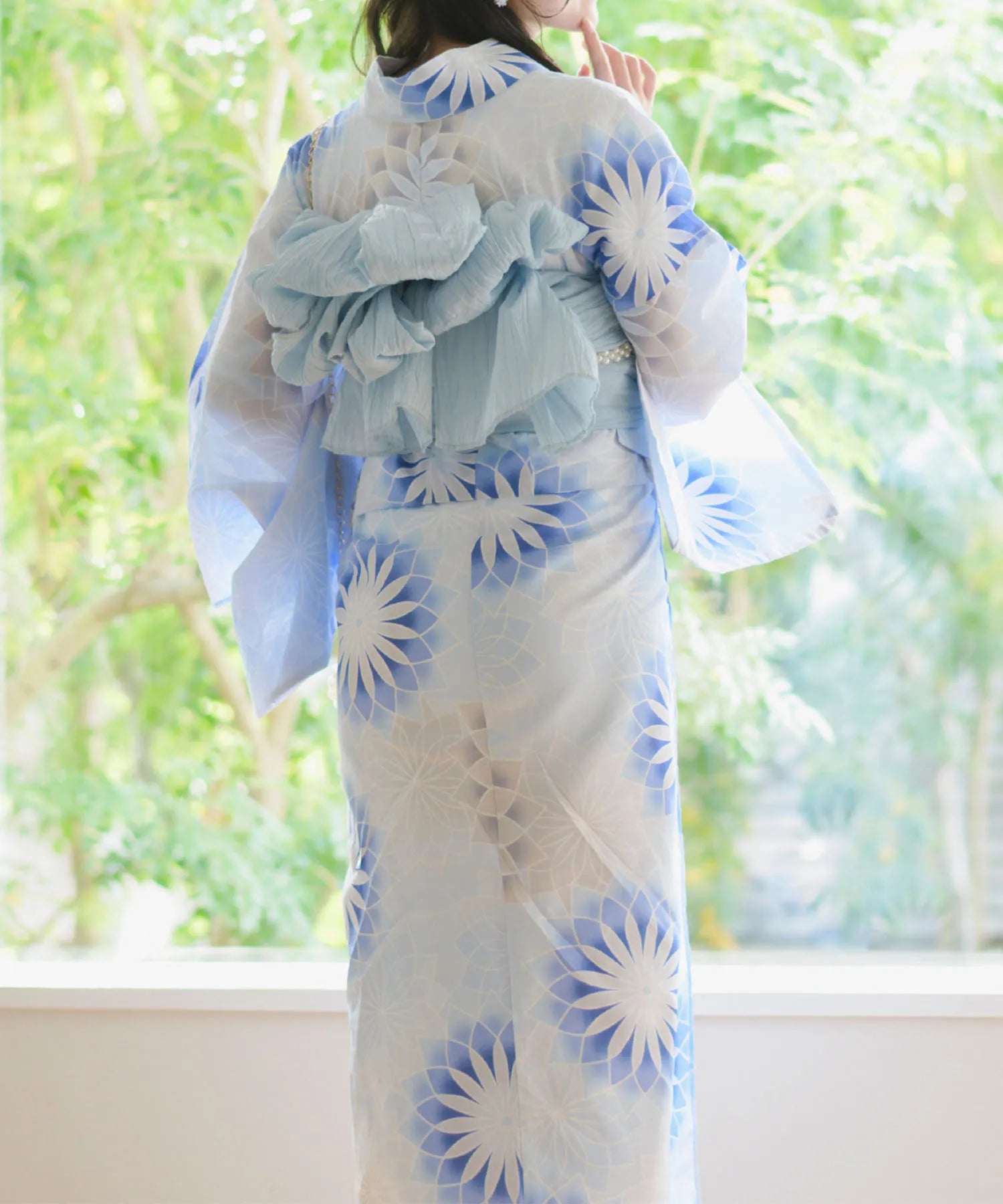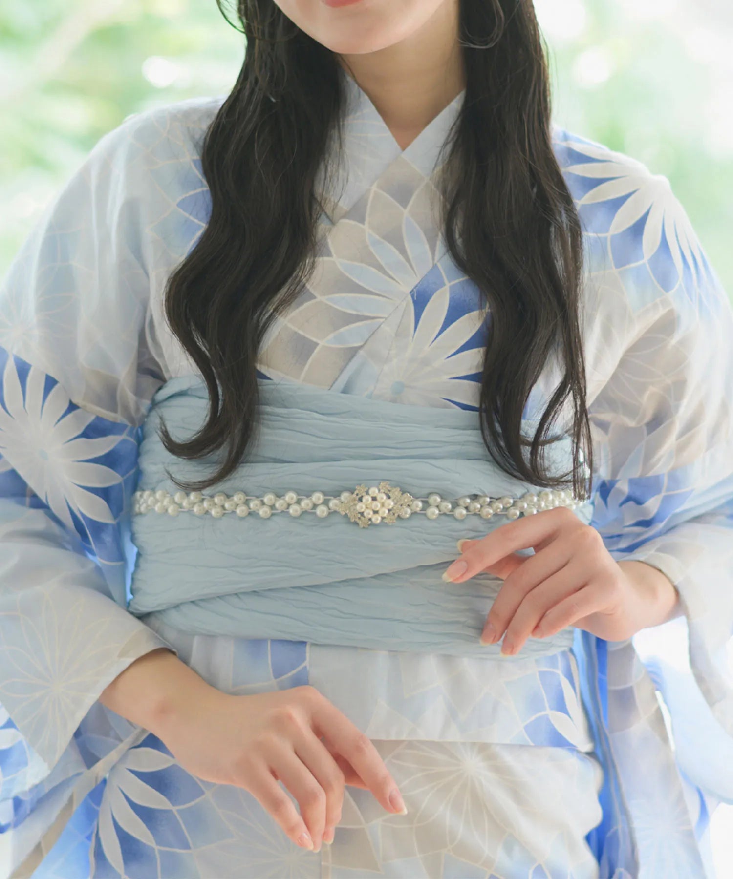 空色の兵児帯で軽やかな夏風を表現し、涼しげでありながらも上品な装いに仕上げています。