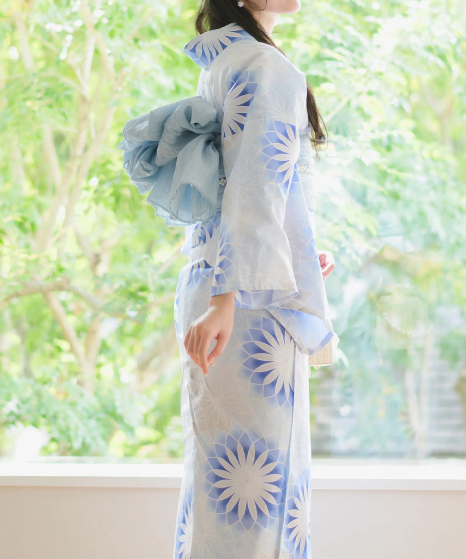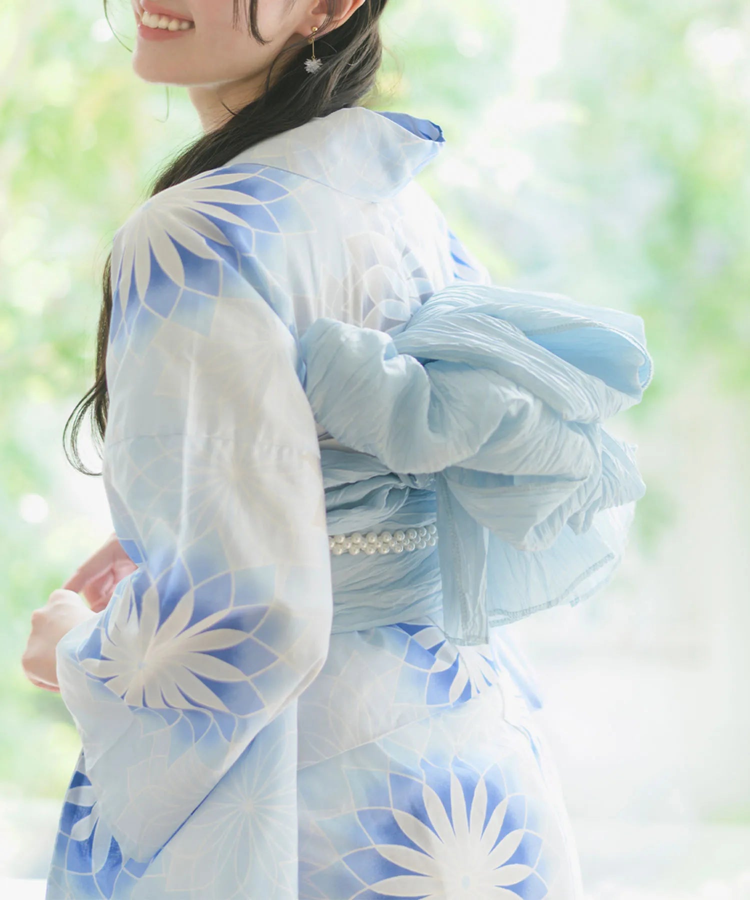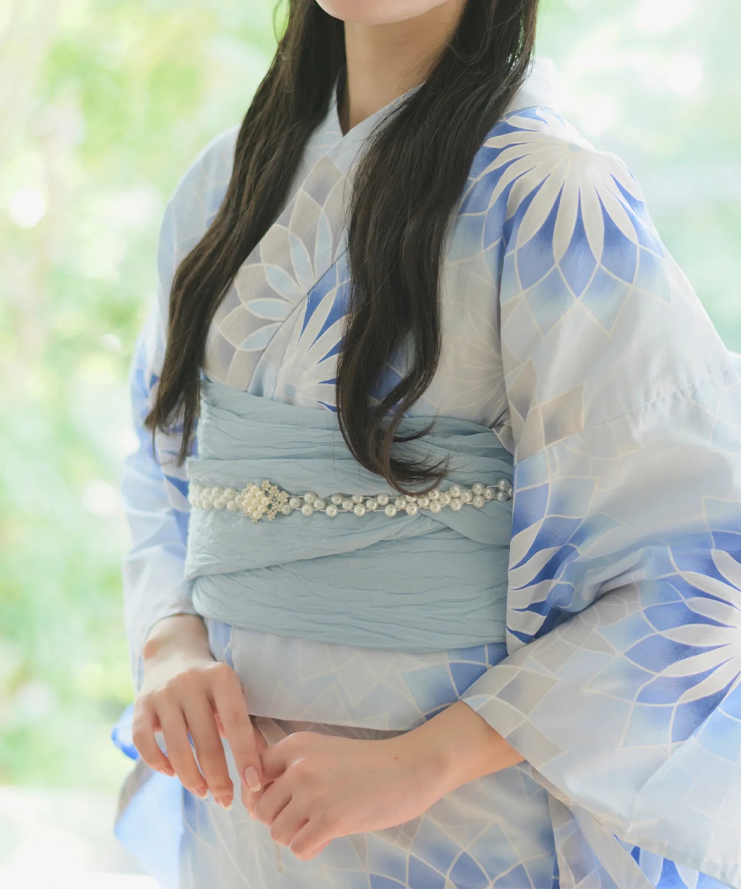 空色の兵児帯で軽やかな夏風を表現し、涼しげでありながらも上品な装いに仕上げています。