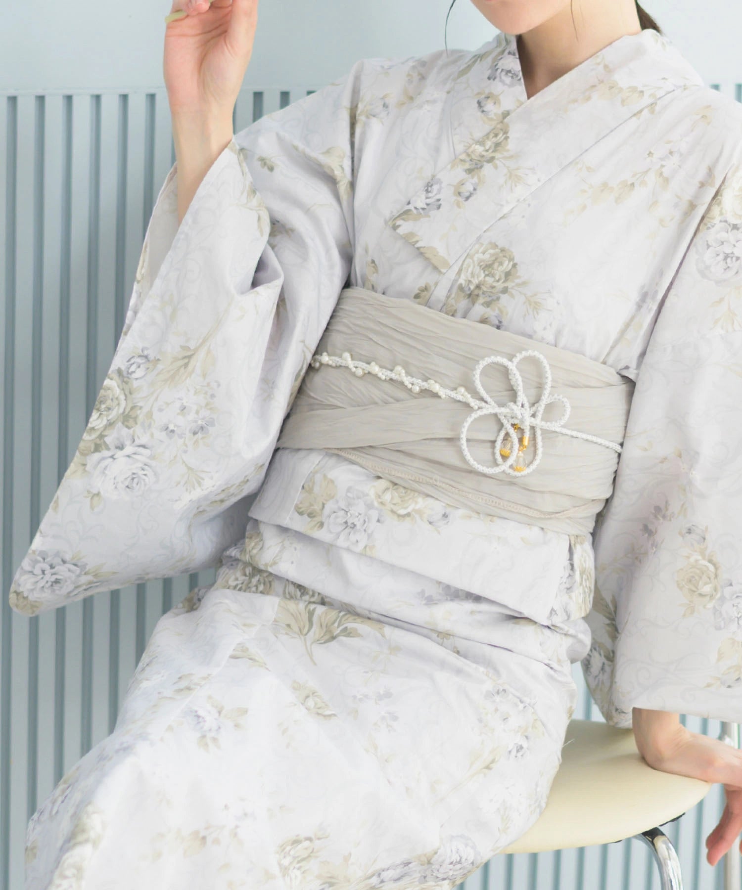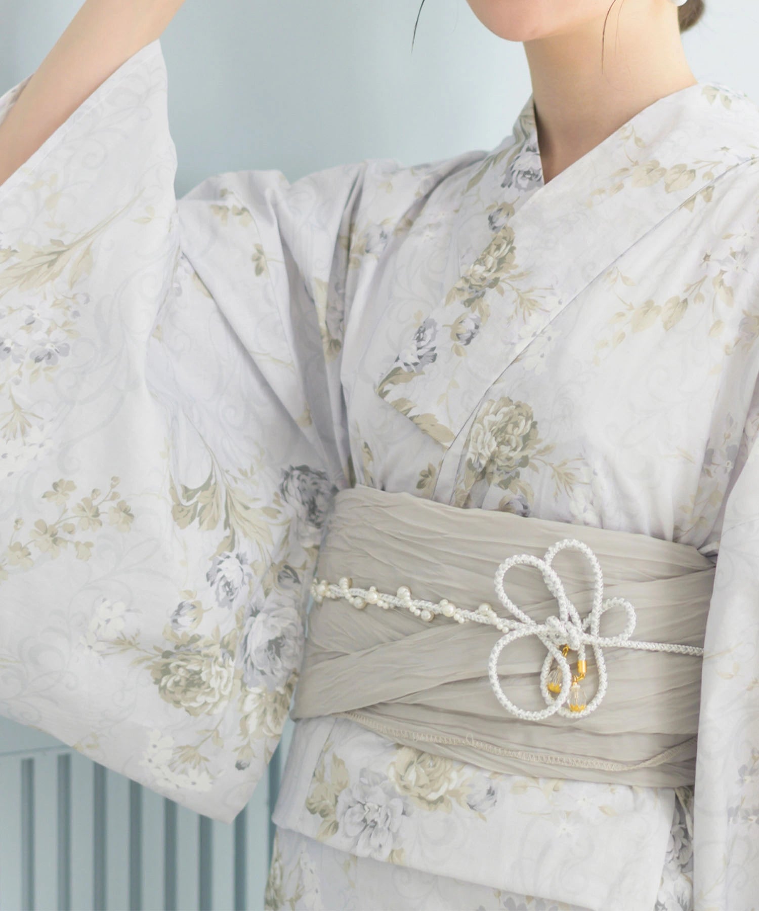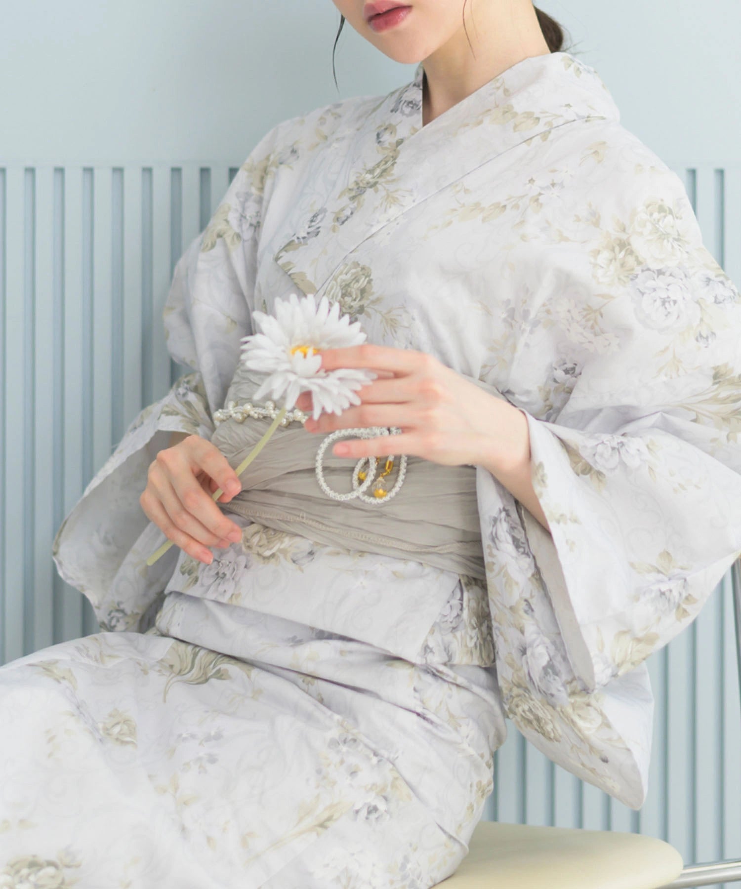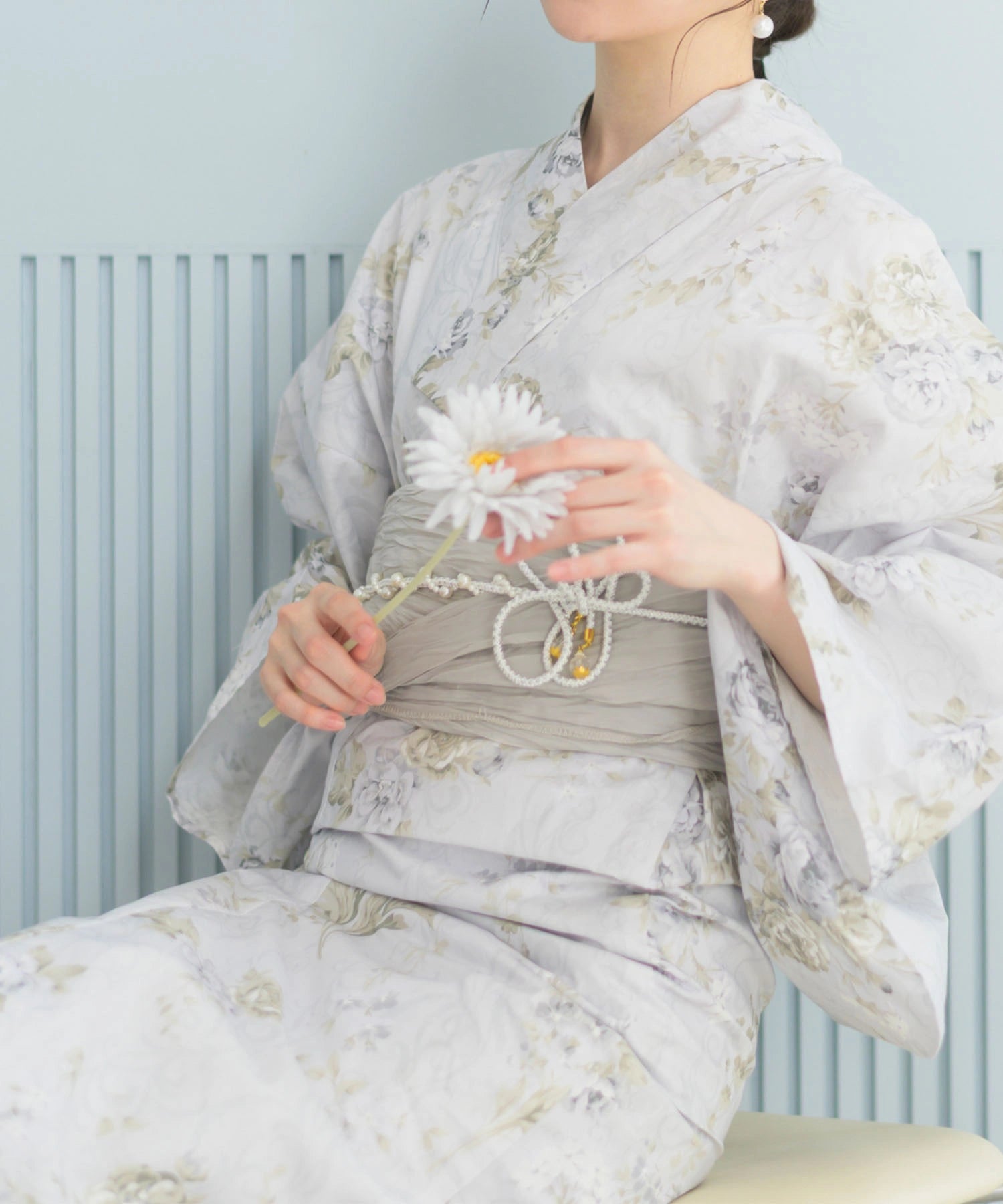 淡いブルーグレーの地にロココ調の薔薇が咲く、アンティークで優雅な浴衣。
