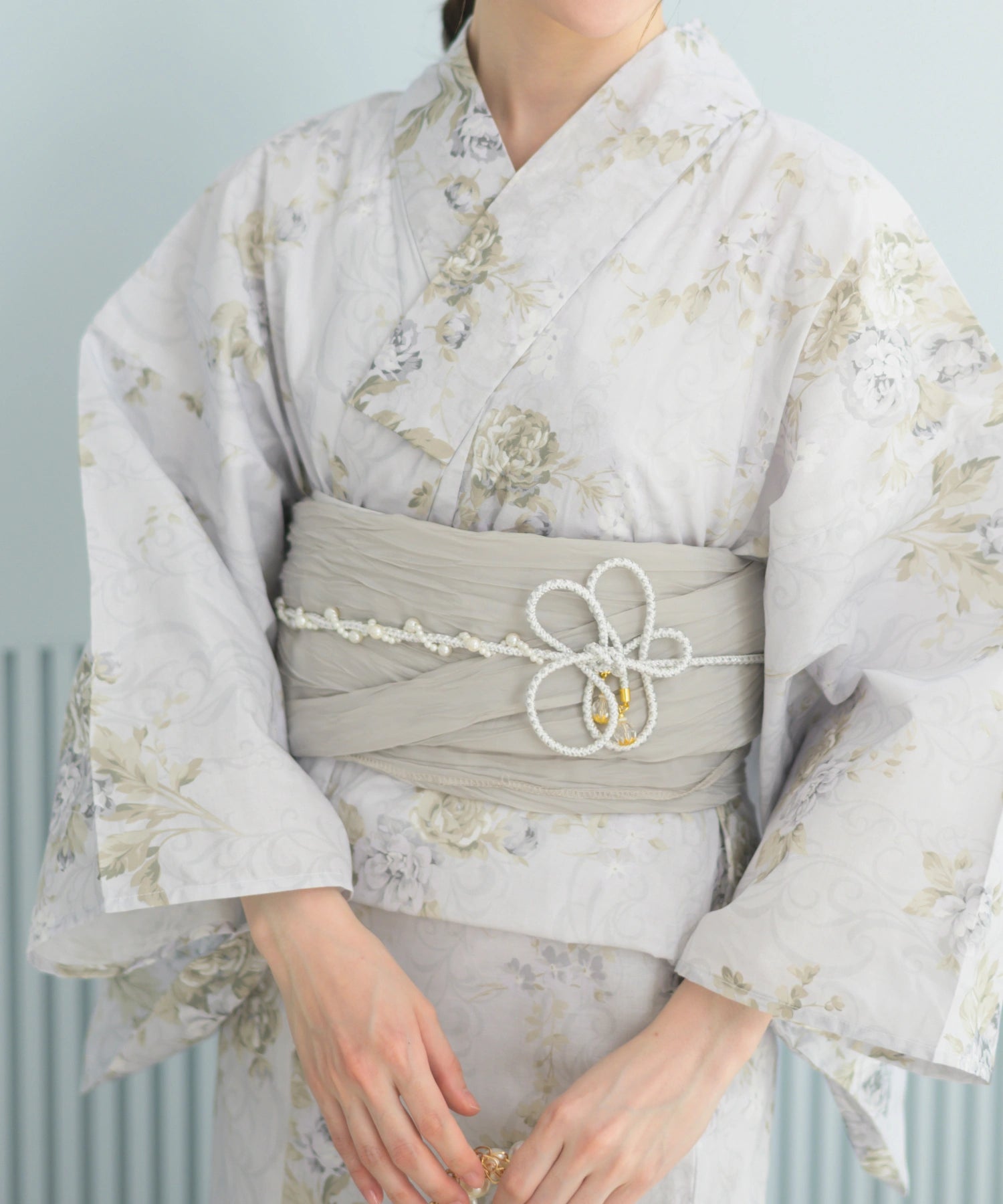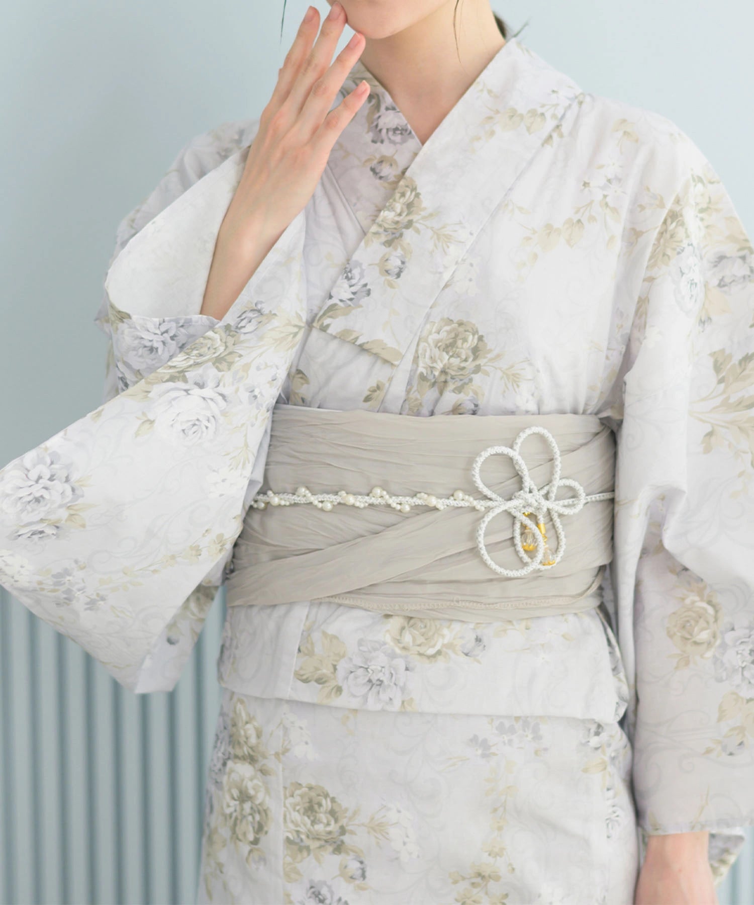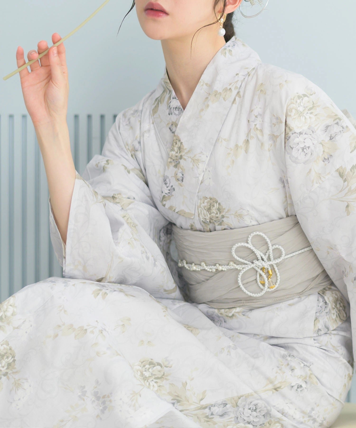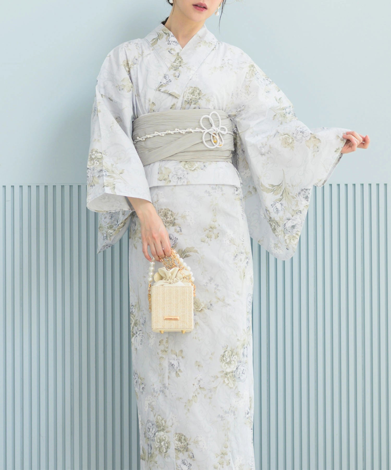 淡いブルーグレーの地にロココ調の薔薇が咲く、アンティークで優雅な浴衣。