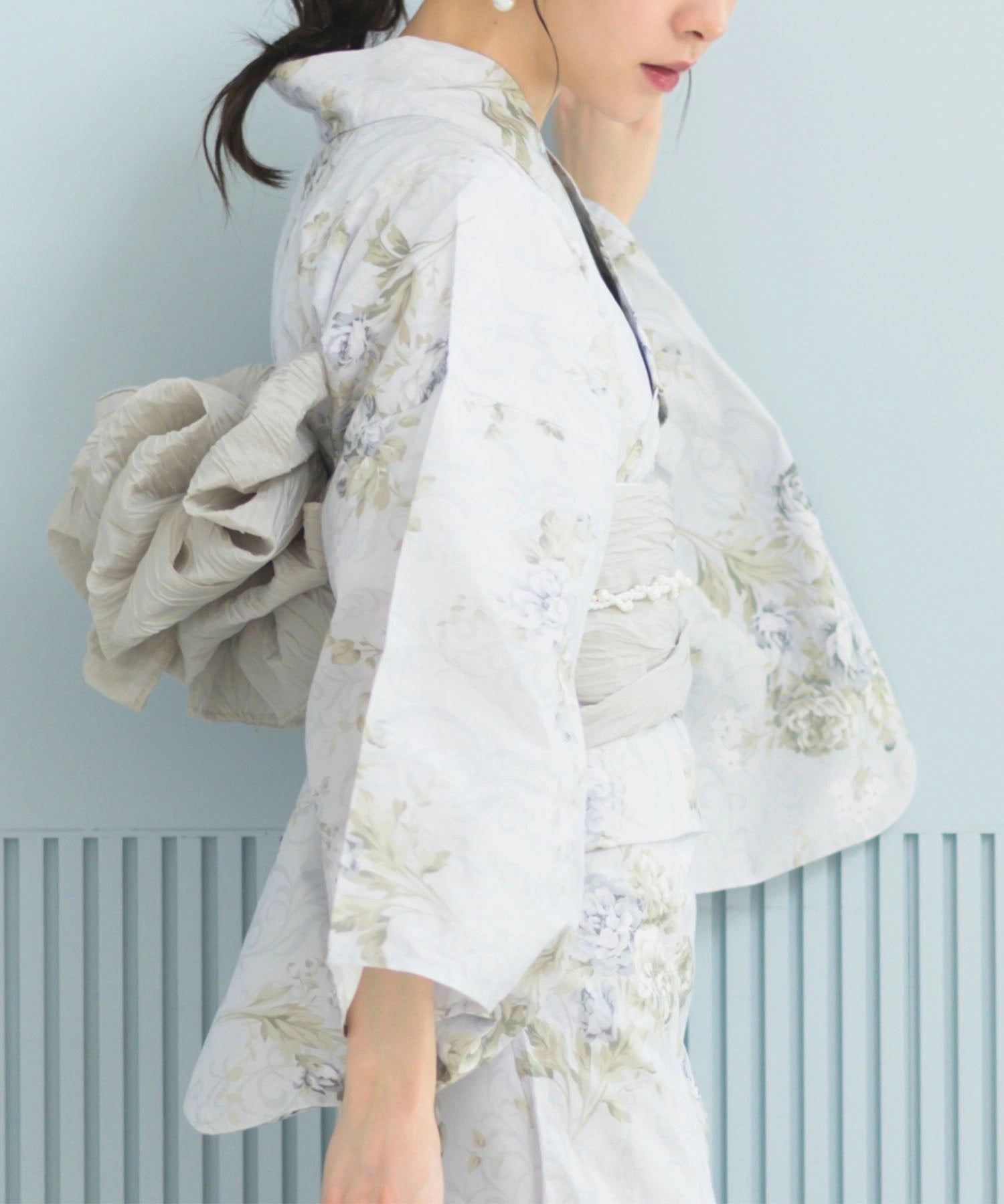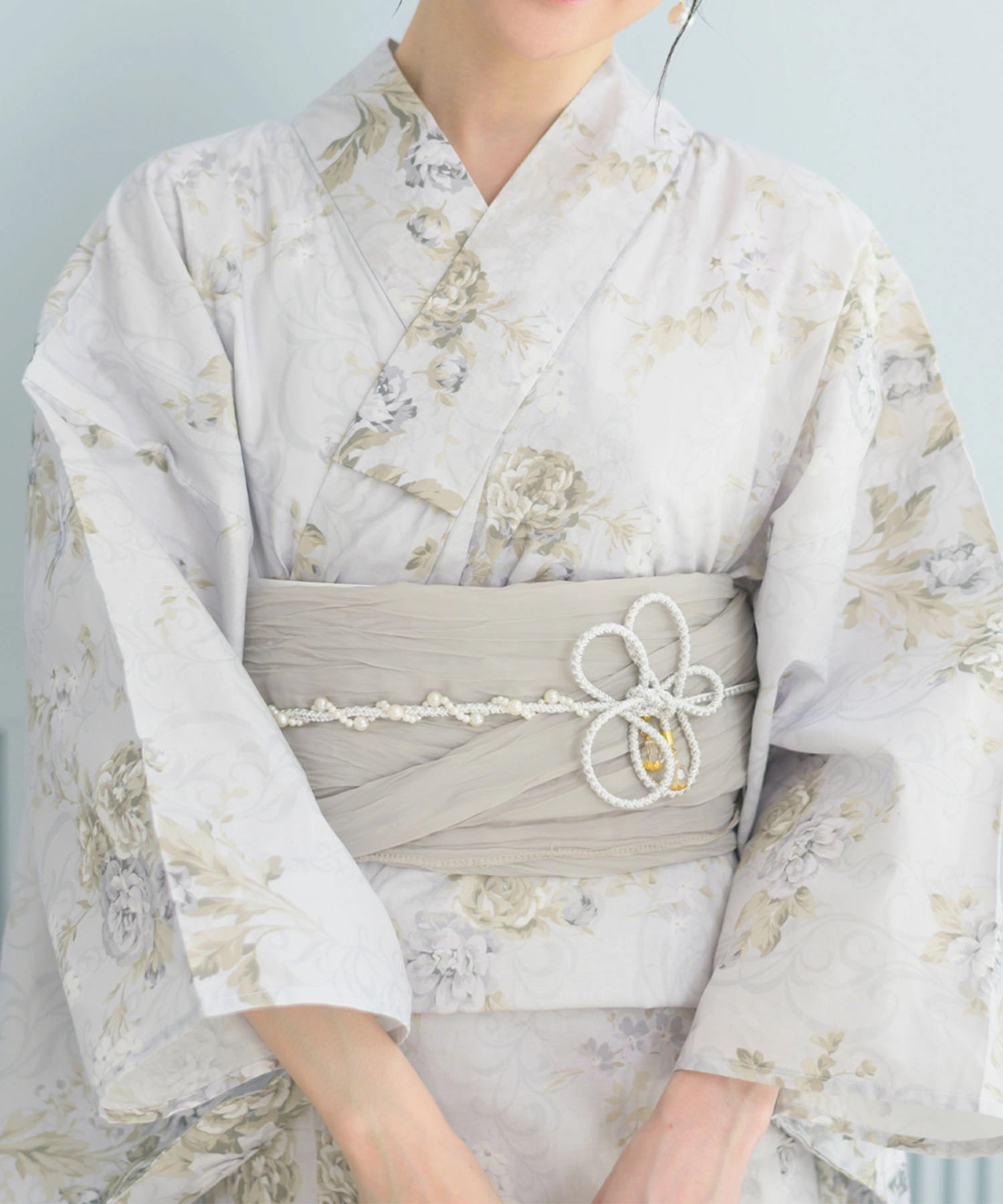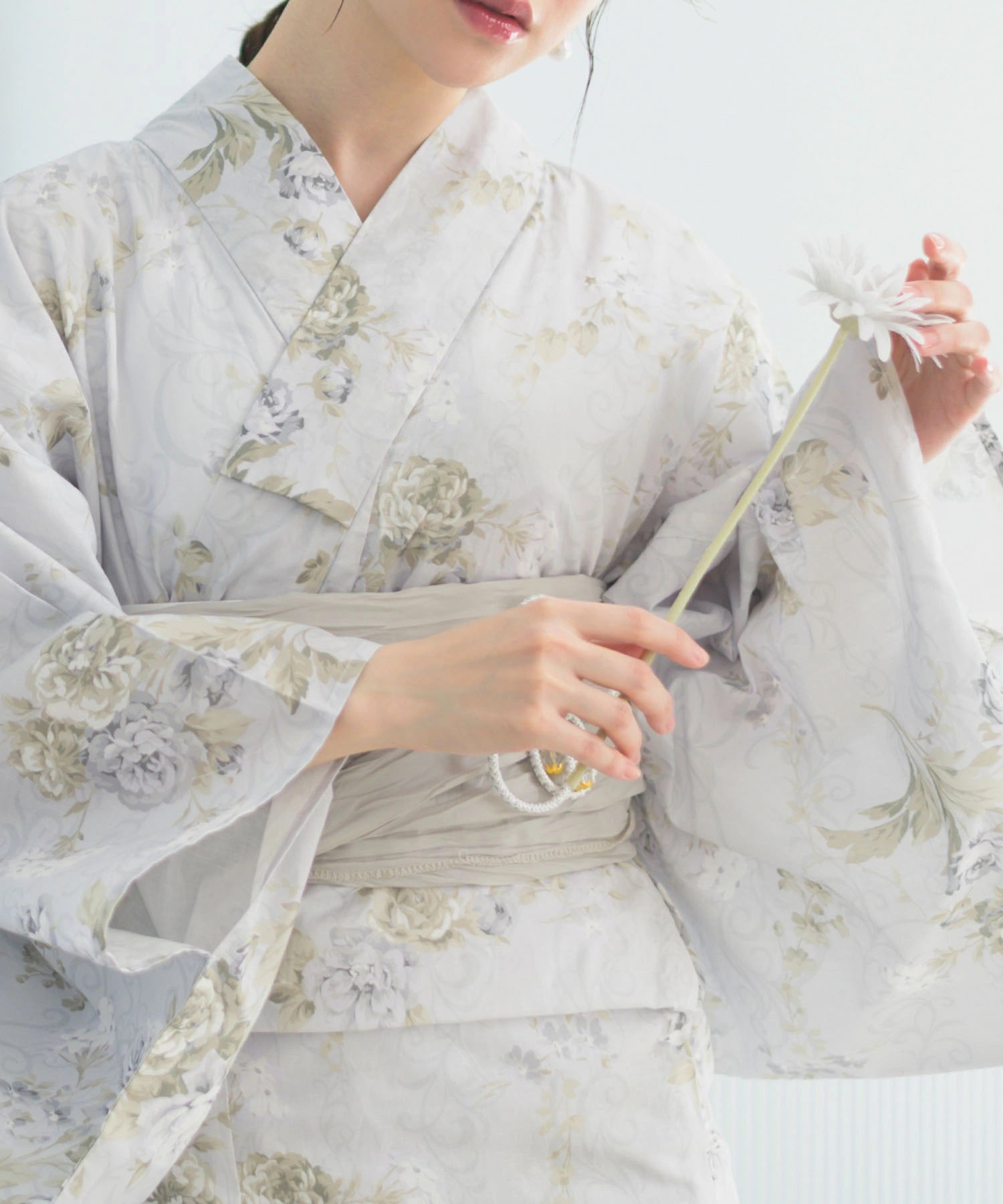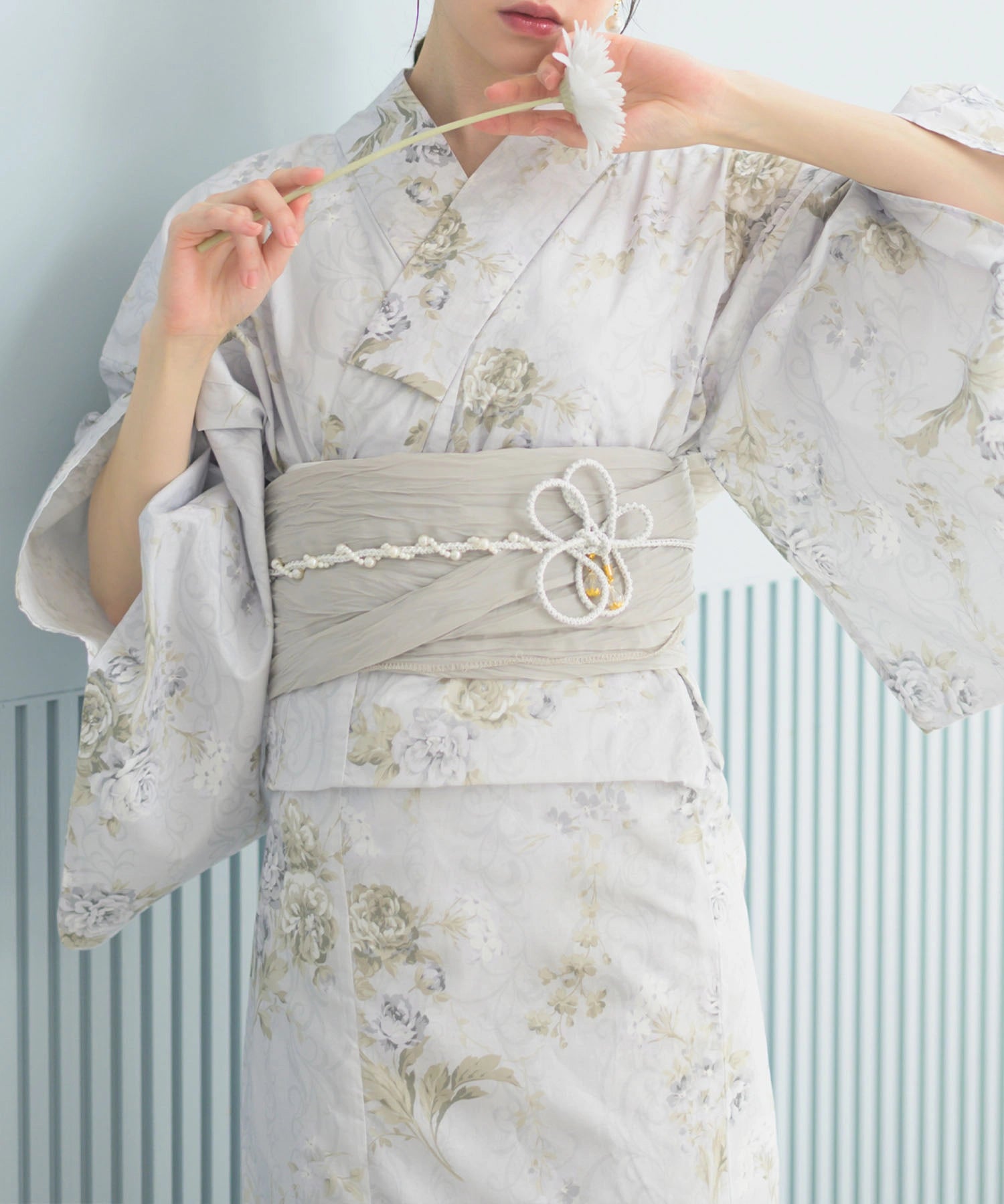 淡いブルーグレーの地にロココ調の薔薇が咲く、アンティークで優雅な浴衣。