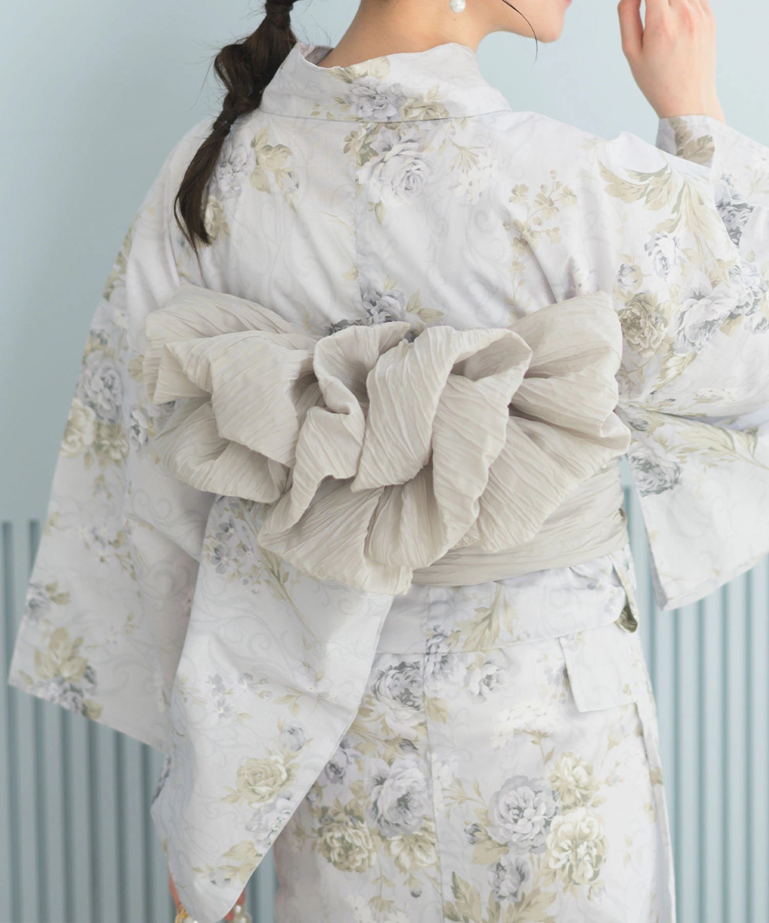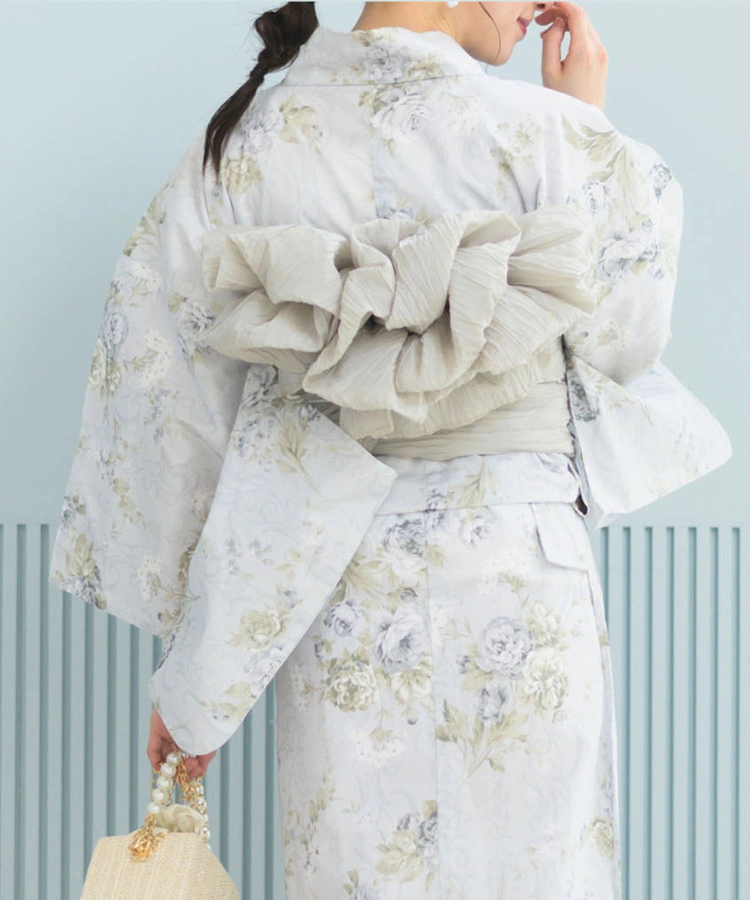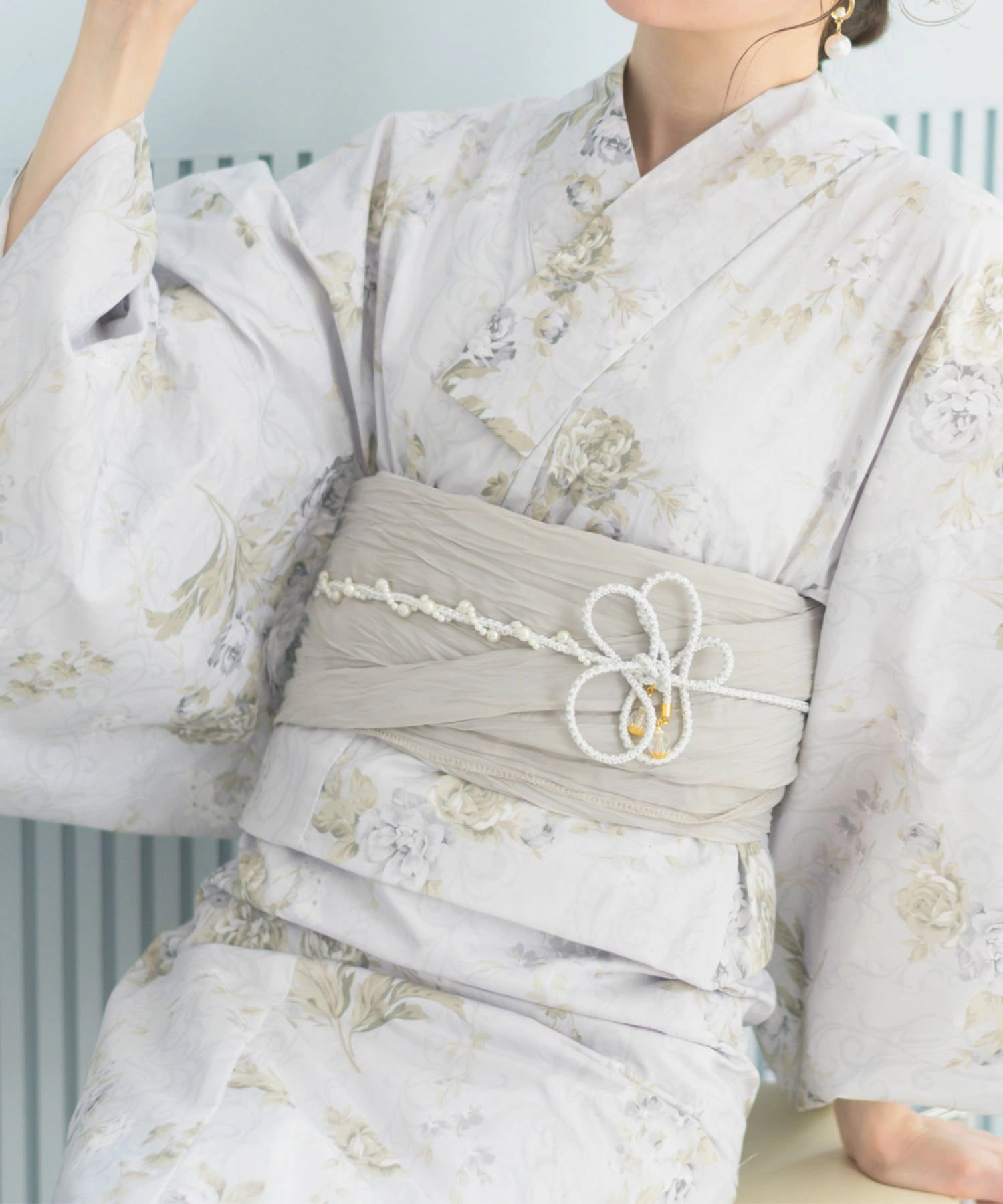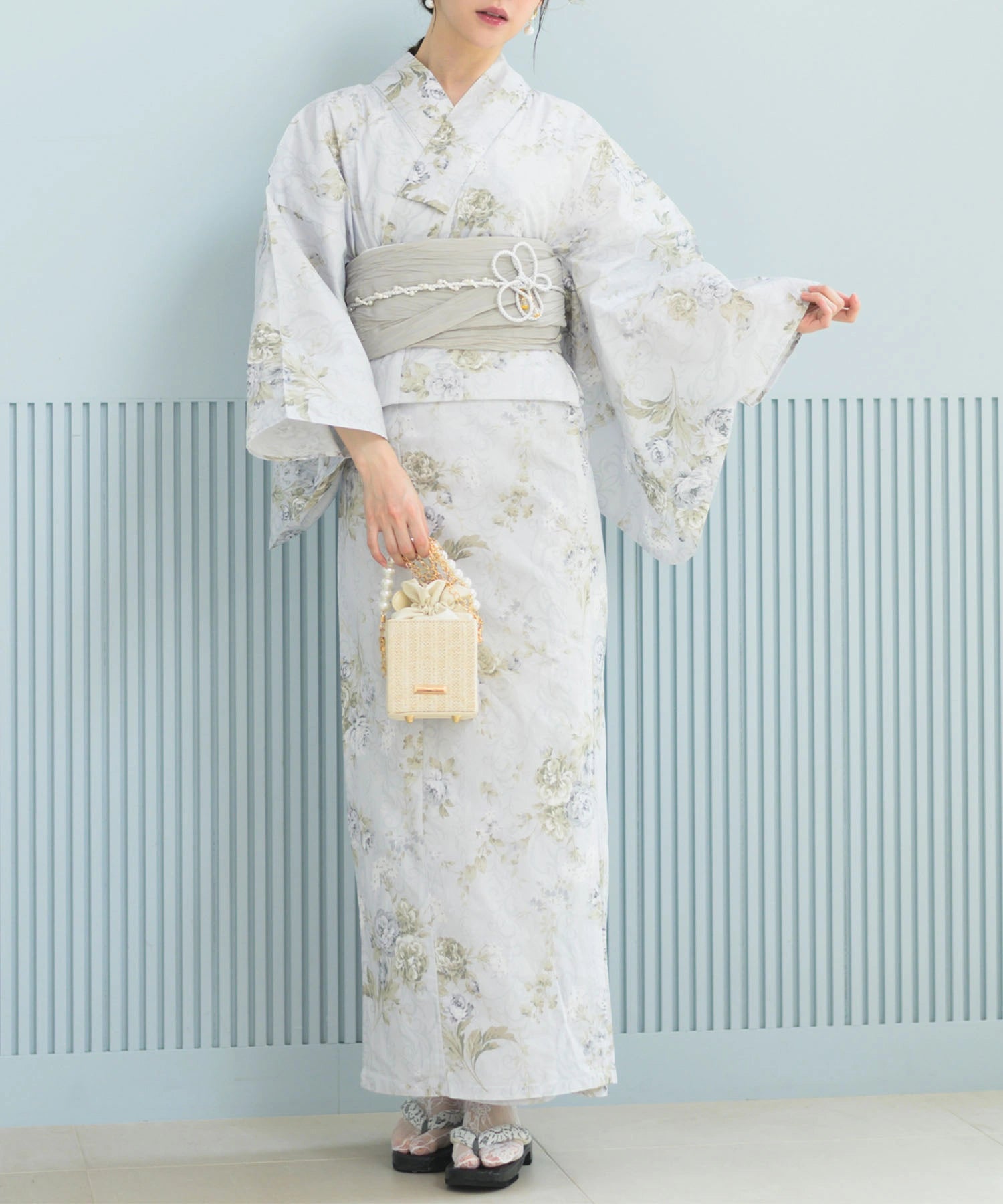 淡いブルーグレーの地にロココ調の薔薇が咲く、アンティークで優雅な浴衣。